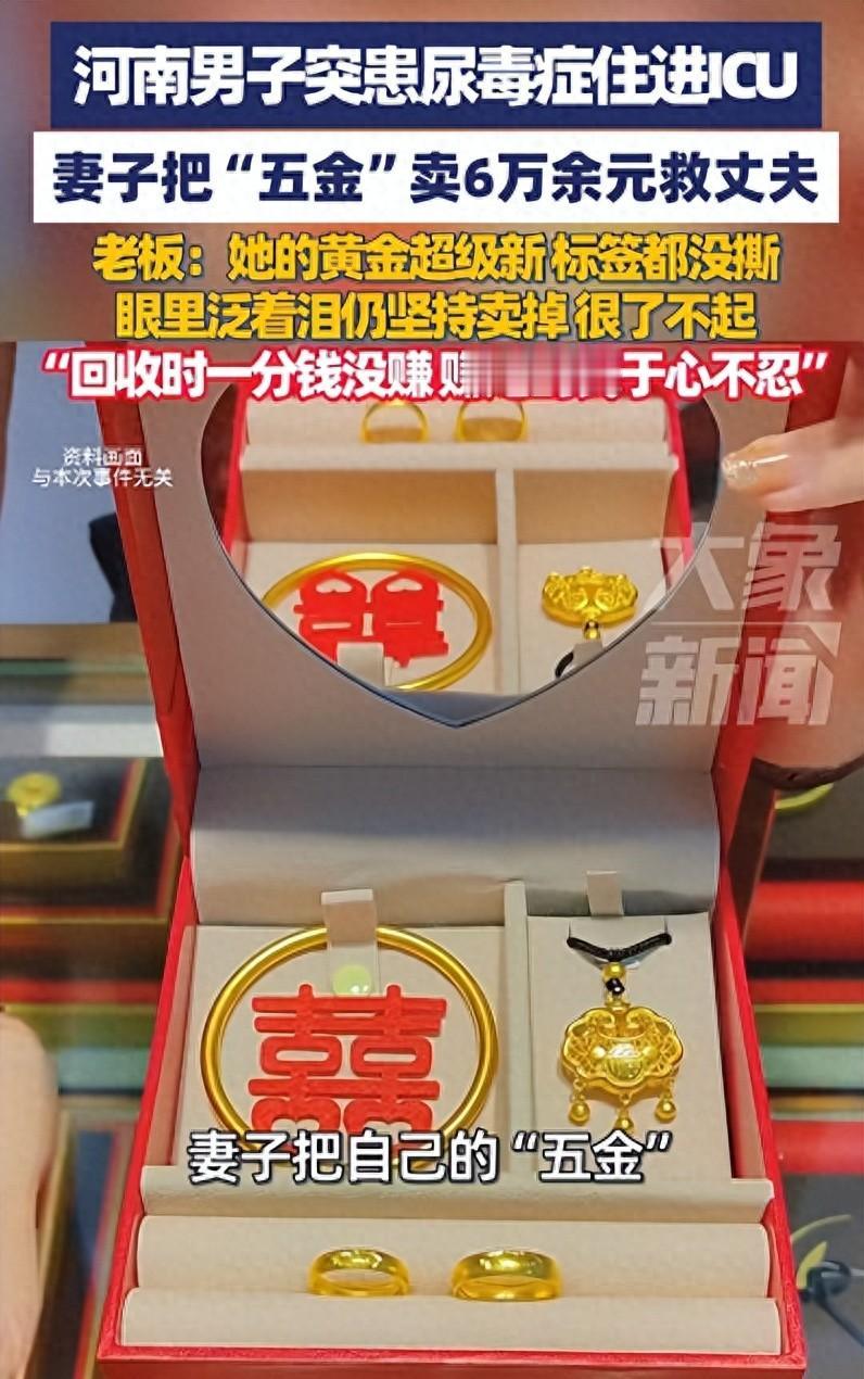 一个年轻女人走进郑州经三路的金店,从包里掏出几件金首饰。项链手镯都没戴过,标签都还在。老板问她是不是刚买的,她说这是结婚时买的五金,现在要卖掉救丈夫。 女人丈夫得尿毒症住进ICU,一天花好几千。她抹着眼泪说这是最后一招了。老板平时收金要赚差价,这次直接按市场价收了,还少要两千块。 当天成交价每克500,总拿到四万五。女人马上跑去医院交费,现在还在凑后续钱。有网友说这事儿看着心酸,也有说老板做得对。金店门口贴着这事时,路过的老太太捐了五百块钱。