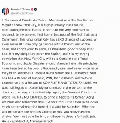 特朗普好像对纽约市市长候选人马姆达尼特别反感,马上就要开始纽约市市长大选了,特朗普对于呼声最高民主党候选人马姆达尼发声了,他开始威胁纽约市选民了,说如果让马姆达尼当选纽约市市长,美国联邦资金不会流向纽约市一分钱! 马姆达尼立即开始反击,号召纽约市市民一起反抗特朗普的霸凌,支持他当选纽约市市长,实现冻结租金,实现公交免费,在纽约市开展供销社等主张! 马姆达尼是乌干达印度裔移民,而且是伊斯兰教徒,如果他当选纽约市市长,将开创两个记录,他开创印度裔当选纽约市市长记录,另外一个身份是穆斯林担任纽约市市长的记录,也是继英国伦敦穆斯林担任市长以后,欧美另外一个大都市市长!