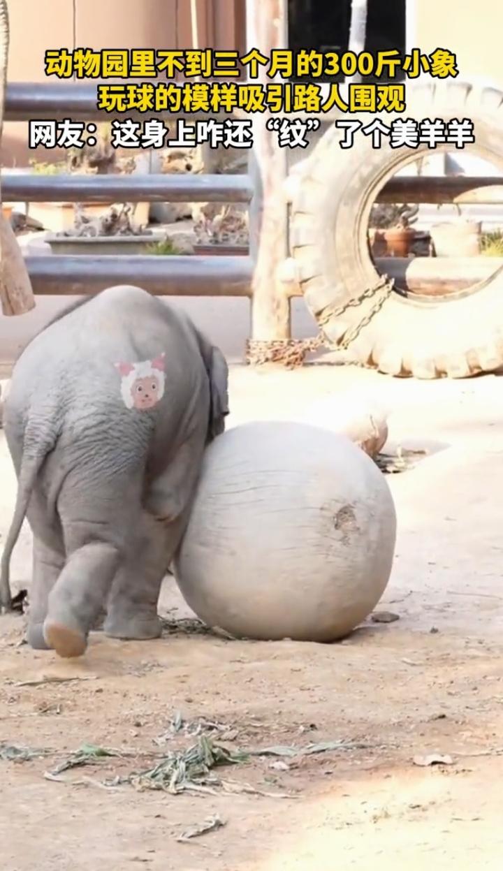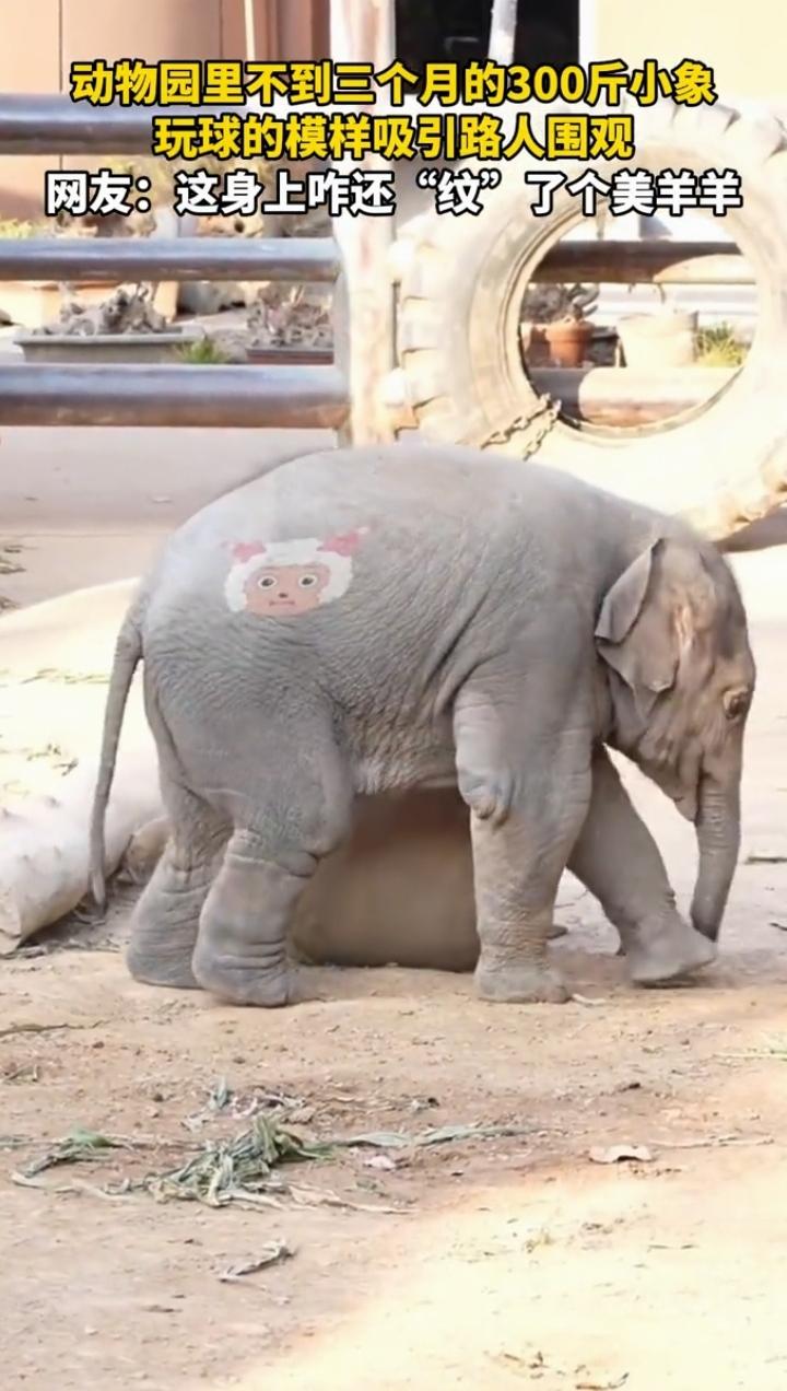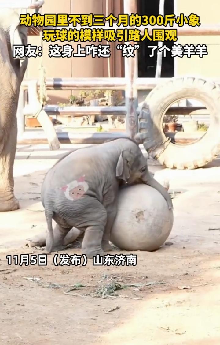 近日山东济南,一女子来到动物园游览,突然,发现象园里有只300斤的小象正在玩球,小象身上还有一个大家熟悉的纹身! 女子发现小象在玩球,动作十分可爱,于是就拍视频记录下了这一幕,还发现小象身上还纹了一个美羊羊的纹身,瞬时带给人不少好感!难道它也看过喜羊羊与灰太狼?难道它喜欢的是里面的美羊羊?所以要求饲养员给它纹了一个美羊羊的纹身吗?真是一只有趣的小象啊!