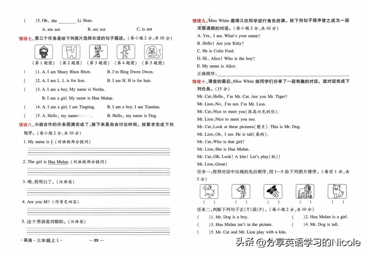 陕旅版英语小学三年级上册第二单元测试题很有特色。就比如有选出不同类单词的题目,像在“he、she、my、you”里选不同类,“my”是物主代词,其他是人称代词。还有选字母补全单词并连线的题,像“ilk”补成“milk”等。 在选择最佳答案中,会考查日常表达,像问“你好吗”用“How are you”,回答“我很好,谢谢你”有对应表述。这些测试题能很好地检验孩子对第二单元知识的掌握,包括词汇、句型等方面,对孩子英语学习的阶段性评估很有帮助。 三年级学生英语 三年级英语试卷