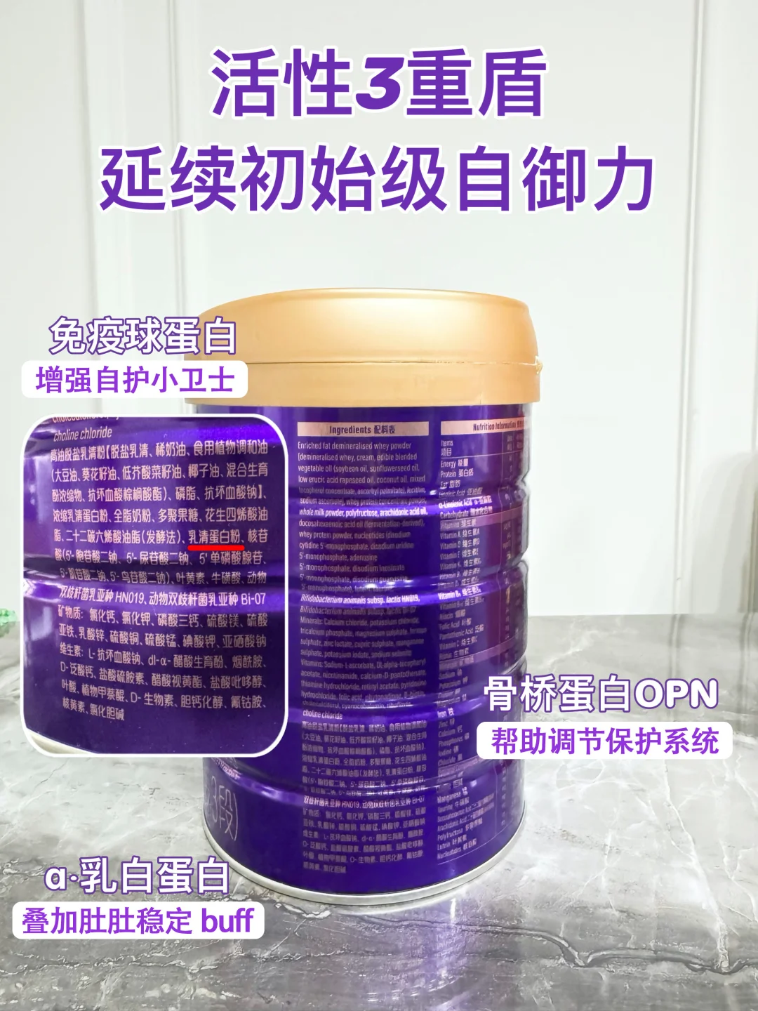 而且,自护方面也特别惊喜到我。它的乳清蛋白里自带3大活性成分,免疫球蛋白是妥妥的护卫小能手,给宝宝建立第一道防线;骨桥蛋白OPN能帮助支持宝宝自己的防御系统,α-乳白蛋白则是维稳肚肚屏障,3重保护强强联合应对外界刺激,宝宝小身板自然越来越好啦!