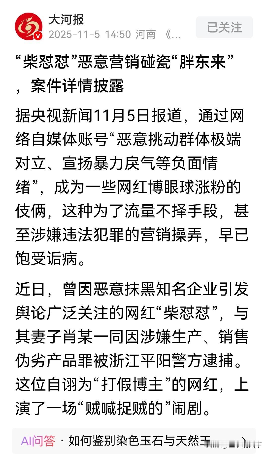 据央视新闻11月5日报道, 网红“柴怼怼”碰瓷胖东来且售卖假货,被警方抓获! 没捞到流量,反倒把自己送进了局子! 网红“柴怼怼”着实爱“惹事生非”,先是恶意营销、碰瓷胖东来以博人眼球,结果还涉嫌生产销售伪劣产品,被浙江平阳警方依法逮捕! 不得不说,为了流量不择手段,甚至不惜违法犯罪,这不是自讨苦吃吗?最终只会搬起石头砸自己的脚,自食恶果! 柴桑怒怼 柴怼怼碰瓷 胖东来商标争议 怒批柴怼怼 柴怼讹钱 柴怼怼藏品 柴怼怼美女
