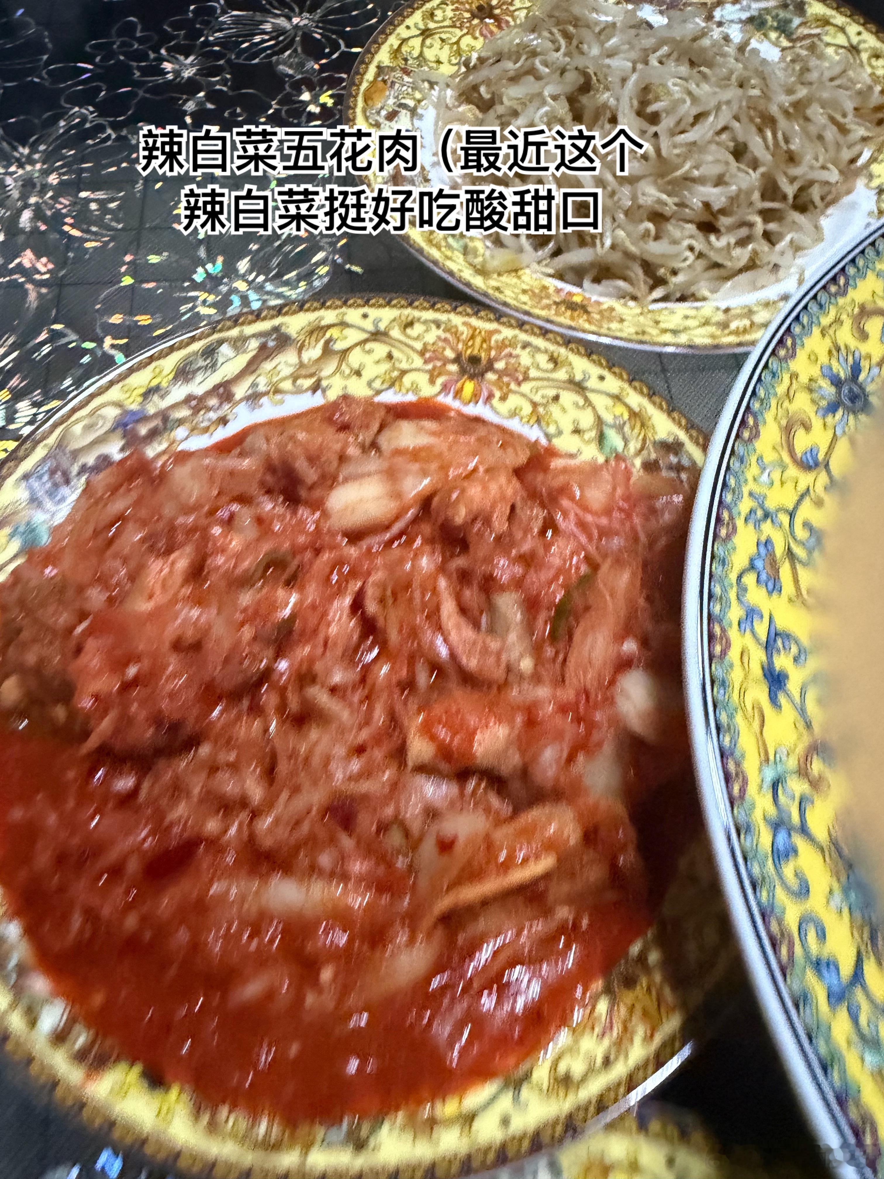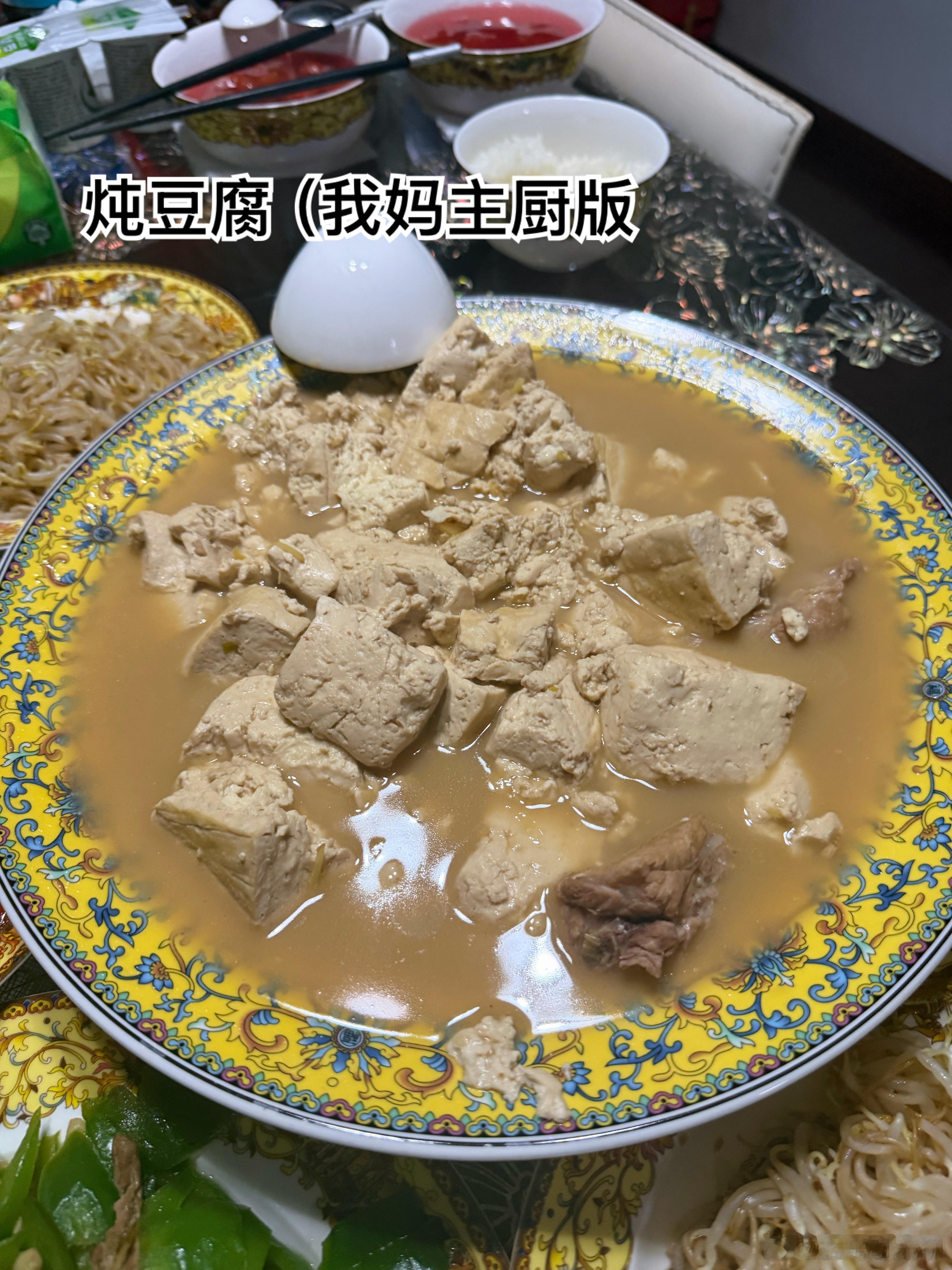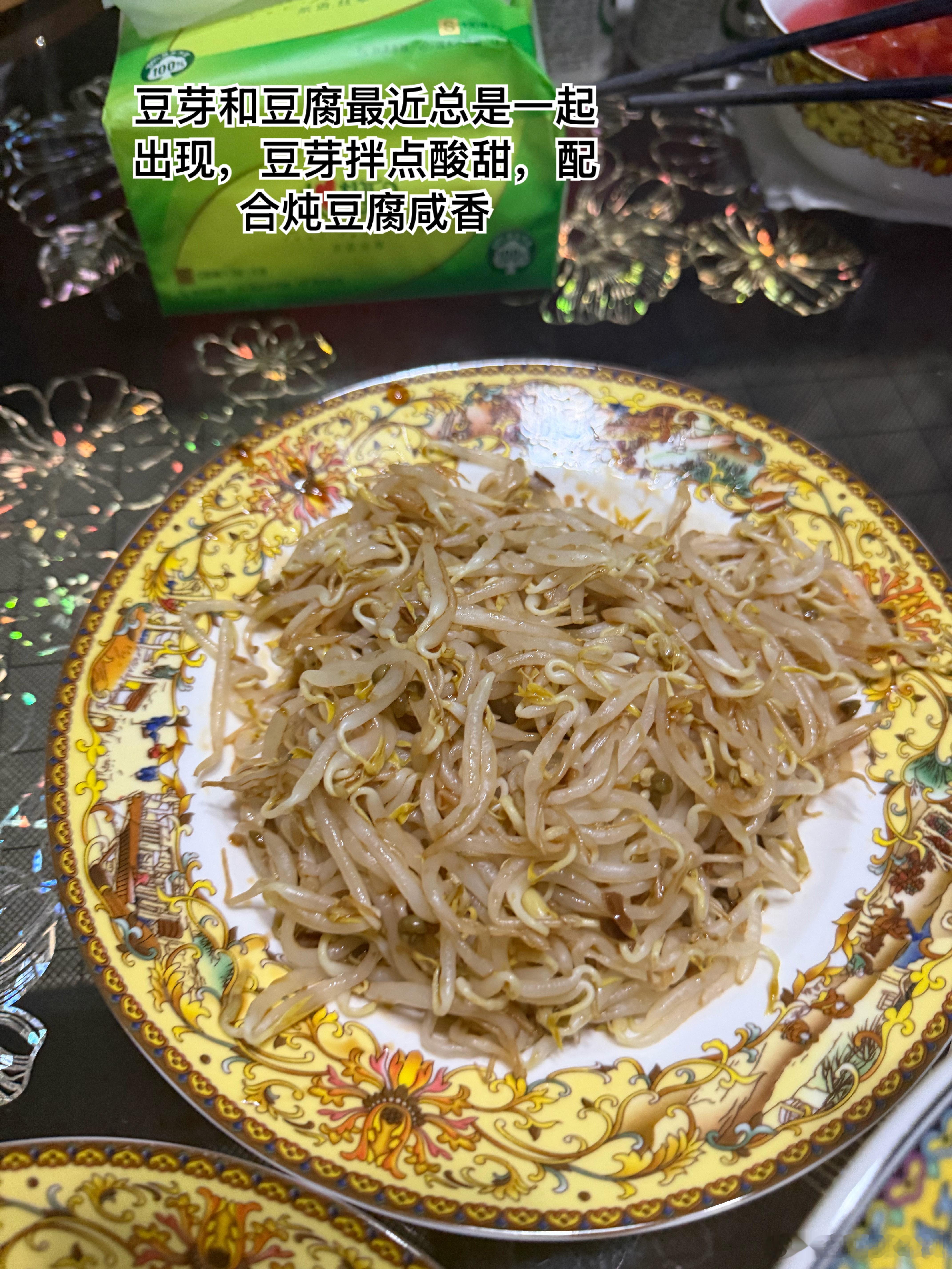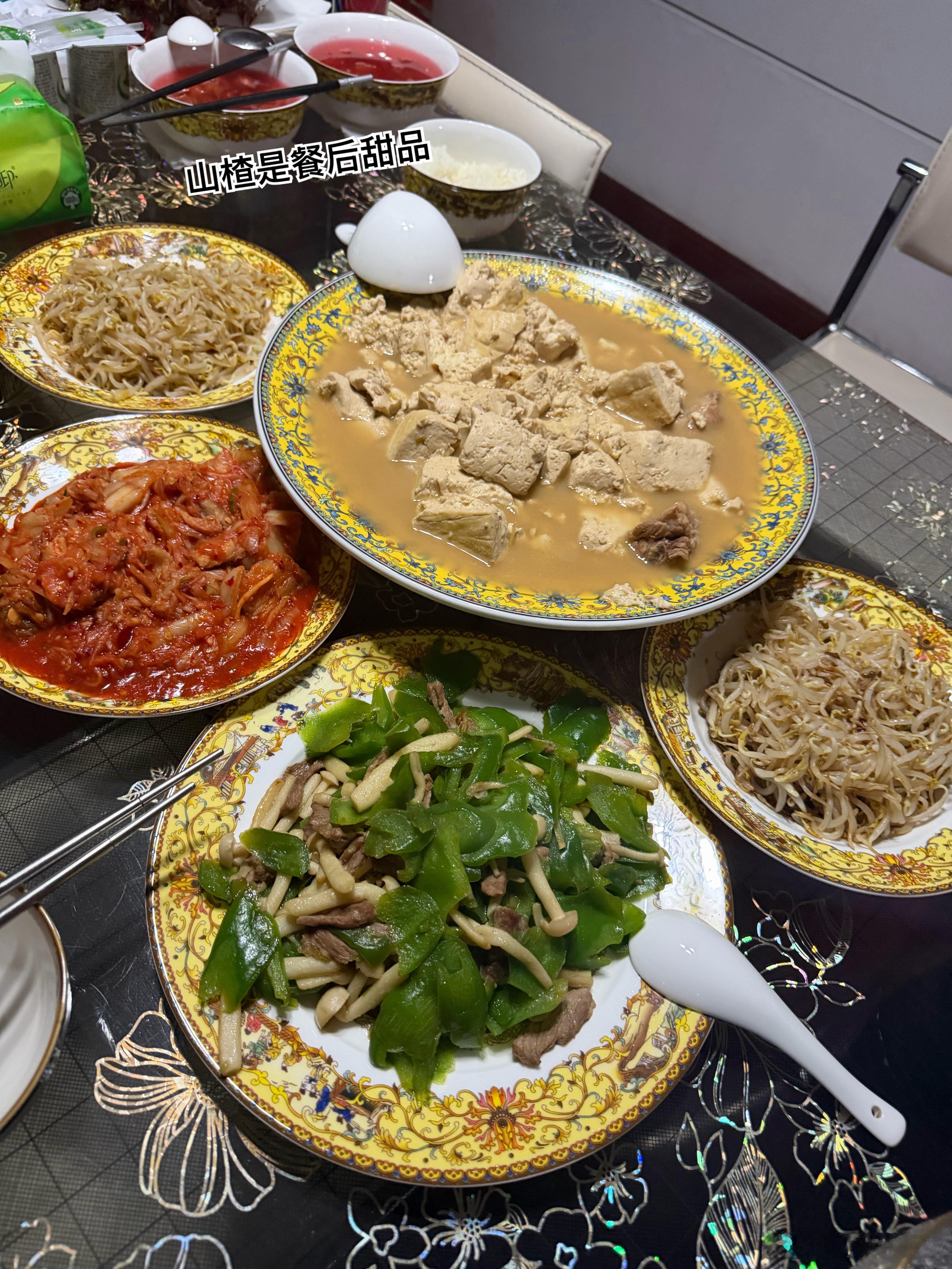 昨晚吃的炖豆腐、拌豆芽、辣白菜五花肉、蘑菇青椒炒肉~