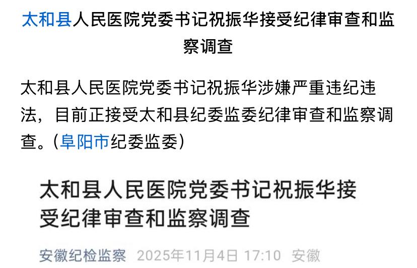 今天安徽省阜阳市太和县的祝振华出事了 祝振华在安徽省阜阳市太和县工作了很多年 以前当过太和县人民医院的一把手 他本应该要全心全意守护人民群众的健康 没想到他却不好好的工作 想着利用职务便利做一些不该做的事情 太和县是一座很美丽的城市 当地的朋友告诉我 他曾经到过这个医院看病 感觉他的医术很好 他看起来非常的敬业 可没想到他会是这样的人 他的行为完全辜负了大家的期望 不好好珍惜这来之不易的工作岗位 不知道他现在后悔不后悔 这也告诉了我们 不管在什么岗位上 都要踏踏实实做好工作
