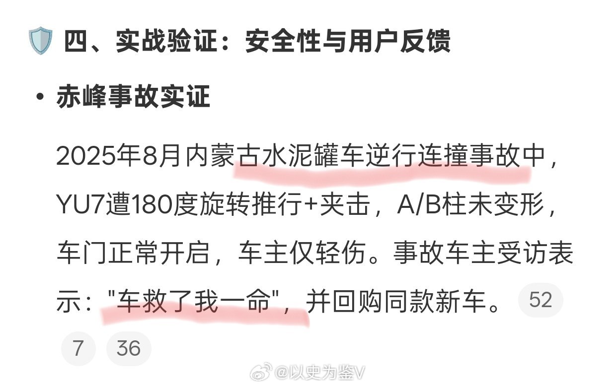 其实最打动我的还是真实的案例,某地泥头车逆行导致多车连撞,一辆小米yu7遭遇180°旋转推行➕夹击,最后A、B柱都没变形,车门正常开启,车主直接说“救了我一命”……