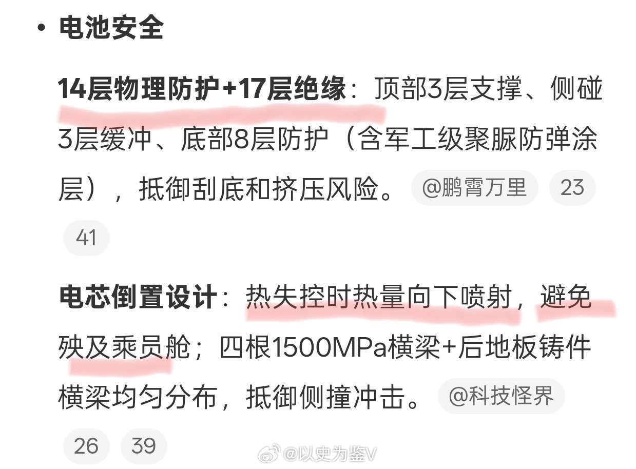 2、14层电池防护:顶部支撑3层、侧碰支撑3层、底部防护8层,最接近地面部分还有防弹涂层。还有高压绝缘防护有17层。