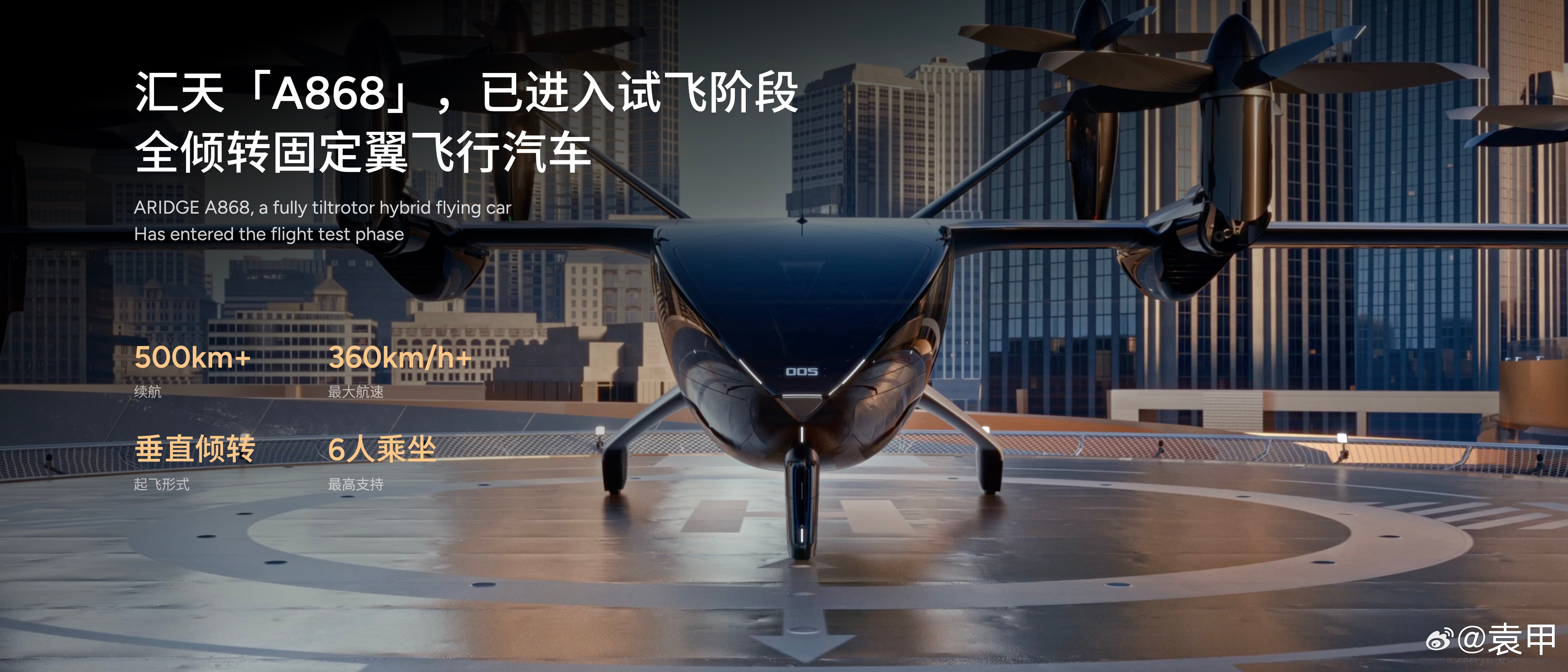 🌟全倾转固定翼飞行汽车「A868」,搭载自主研发的航空级增程系统,可以实现最高500km+续航,最高实现360km+/h的航速,乘坐最高支持6人。