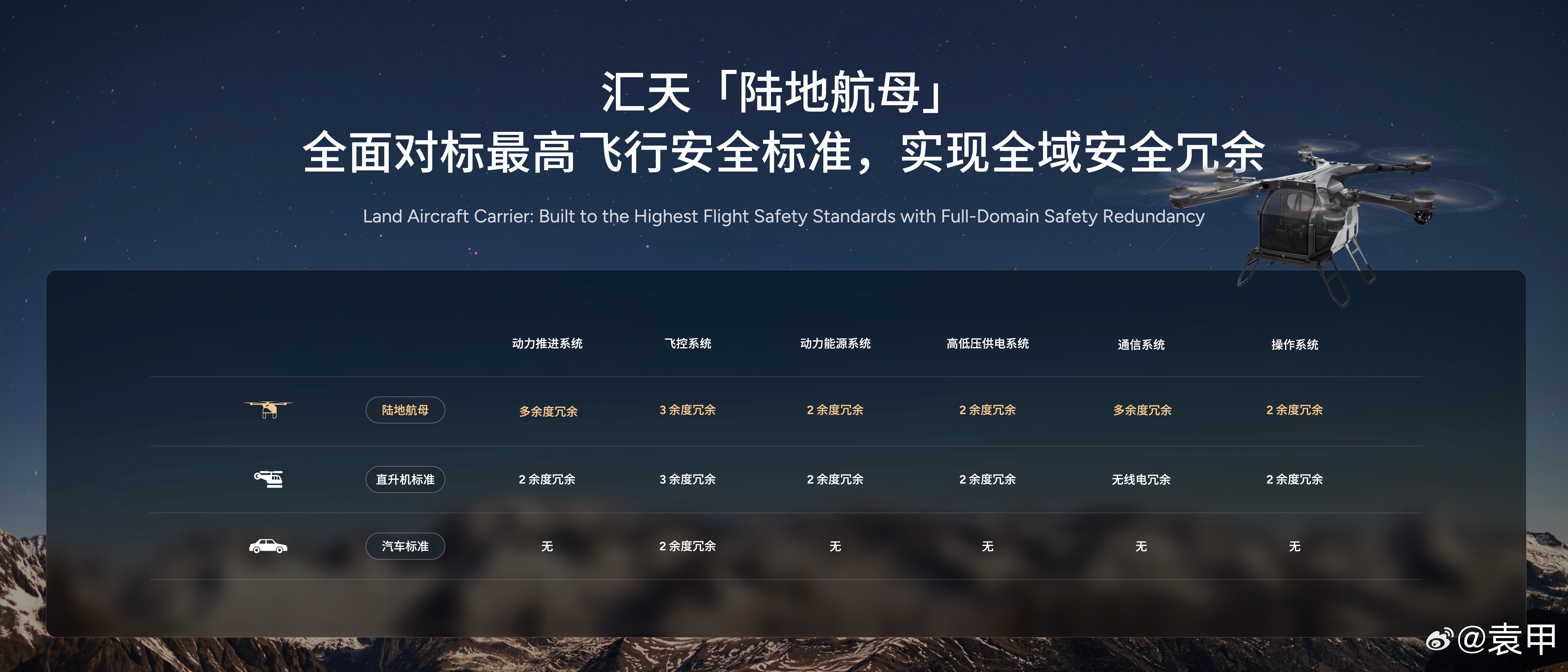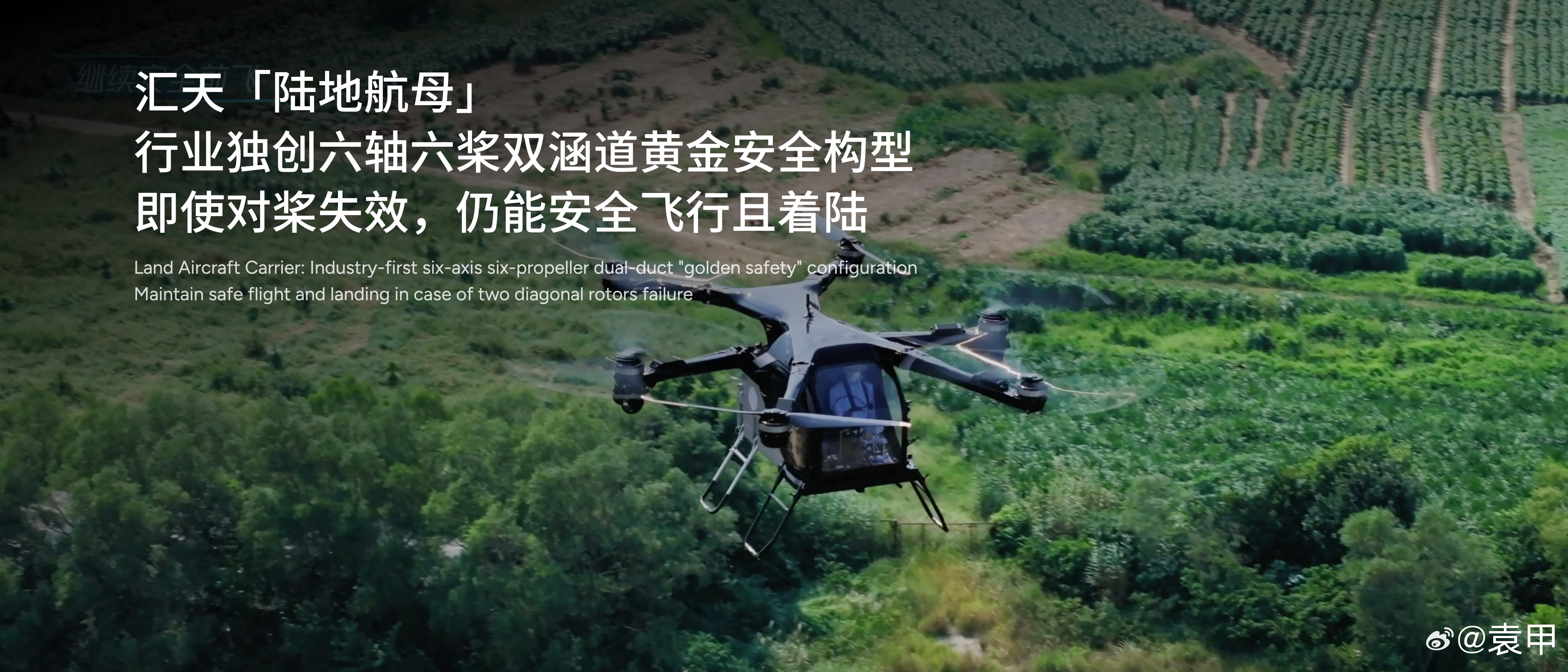 🌟全球首款量产飞行汽车「陆地航母」,其综合续航里程CLTC超过1000公里,预计2026年规模化交付,全面对标最高飞行安全标准,实现全域安全冗余;行业独创六轴六桨双涵道黄金安全构型,即使对桨失效,仍能安全飞行且着陆。