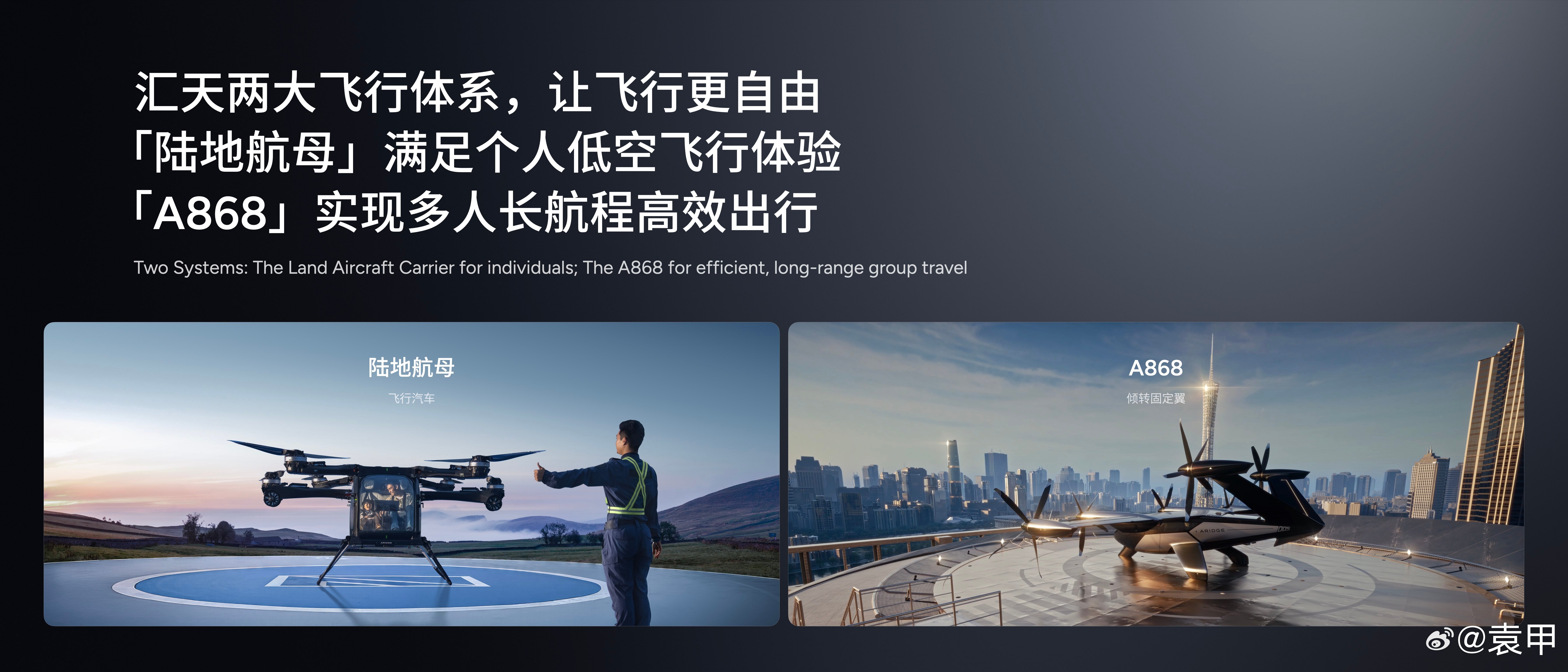 汇天两大飞行体系,「陆地航母」满足个人低空飞行体验,「A868」实现多人长航程高效出行。