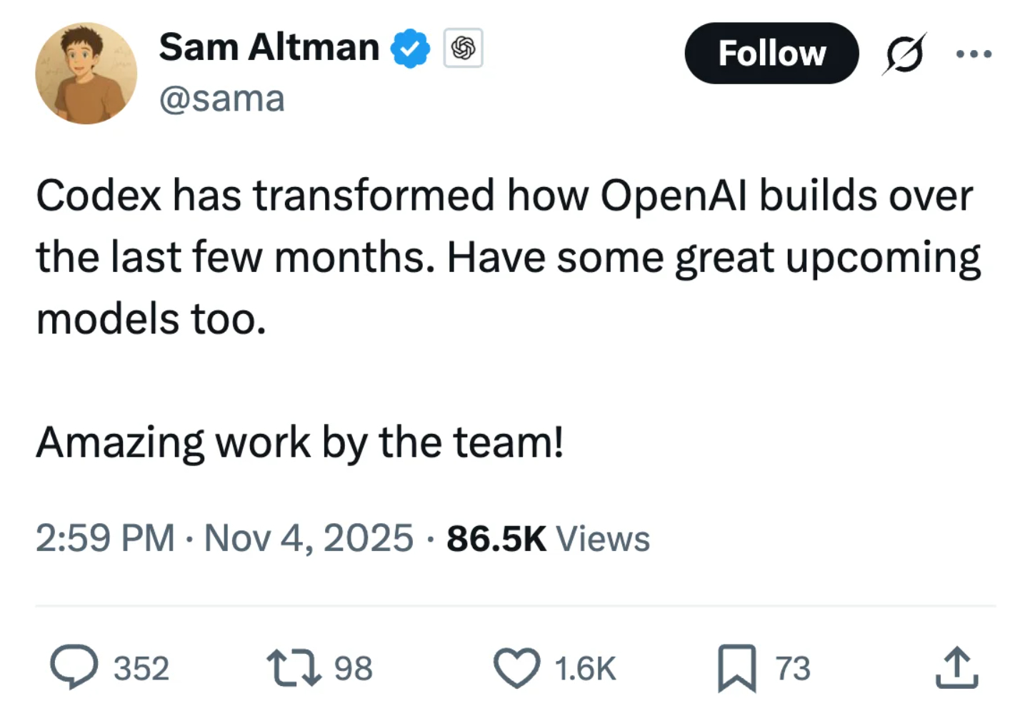 Sam Altman透露:Codex 已经彻底改变了 OpenAI 的开发方式。意思很明确:连训练 GPT 的人都离不开 AI 写代码了。现在AI 编程已经从实验玩具变成了生产力标配,这下真没人能说它只是噱头了。ai