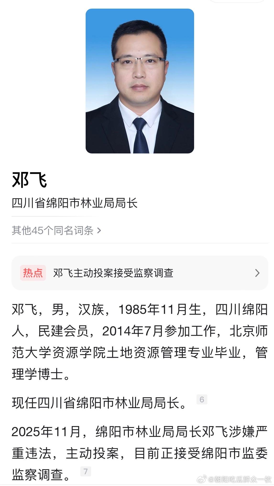 四川绵阳市监委11月5日消息,绵阳市林业局局长邓飞涉嫌严重违法,主动投案,目前正