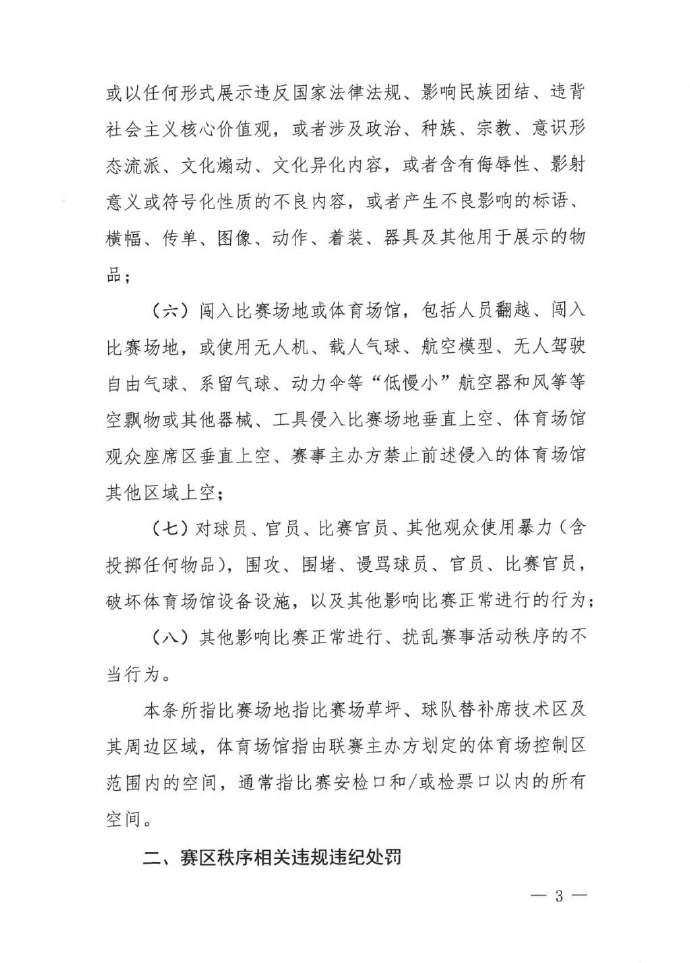 中足联明确观众8类不当行为中国足球职业联赛联合会关于印发《中国足球职业联赛联合会纪律与道德准则》第八十八条实施细则的通知。 观众干扰比赛、有侮辱挑衅言行等,赛区将被处罚。