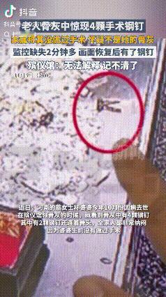 “无法解释,记不清了”!生前没有做过手术,去世后火化骨灰出现钢钉,殡仪馆:无法解释,记不清了! 河南,蔡女士称自己婆婆今年10月份因病去世,在殡仪馆领骨灰的时候发现骨灰中有4颗钢钉,有两颗还连着骨头,让人纳闷的是婆婆生前没有做过手术,调取监控发现监控画面缺失了2分20秒,殡仪馆说是线路老化引起缺失,至于出现钢钉无法解释,也记不清了。目前公安已经介入, 这事换做任何人都会有所怀疑,生前没有做过手术,那么骨灰中就不可能出现钢钉,但是现在问题是发现了钢钉,殡仪馆无疑就存在很大的嫌疑,要么就是遗体弄错了,要么就是殡仪馆工作人员有所失误,不管怎样不能用一句“无法解释,记不清了”来搪塞家属,这事必须要给家属一个交代,不然以后家里老人了,谁还敢把人送去殡仪馆。