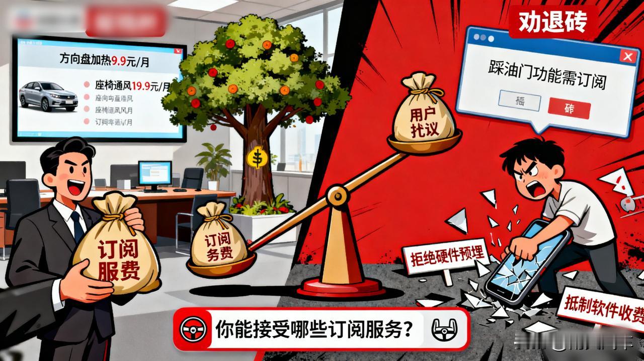 订阅制服务,是车企的“摇钱树”还是“劝退砖”? 方向盘加热、座椅通风要按月付费?以后是不是踩油门也要订阅了?硬件预埋,软件收费,这商业模式听起来很美,但吃相太难看会彻底得罪用户。 你能接受哪些汽车订阅服务? 车企收费 汽车功能付费 订阅制汽车 订阅制商业 豪车订阅 订阅费 订阅制产品