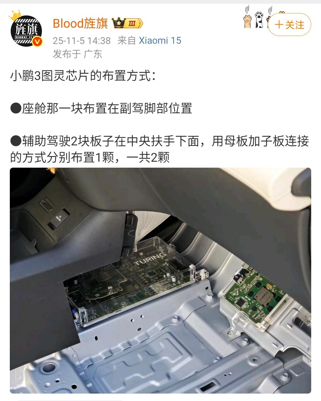 艹老师:小鹏3图灵芯片的布置方式: ●座舱那一块布置在副驾脚部位置 ●辅助驾驶2块板子在中央扶手下面,用母板加子板连接的方式分别布置1颗,一共2颗 看到这个终于知道为什么大家都说泡水车不能买,虽然当时看着是没什么问题,但是如果这些电路板都进水了,可能以后用着用着,电气系统就会出现故障。 所以对于大多数人来说,购买二手车还是得找一个靠谱的检测机构看一看。各位是怎么看的?欢迎评论区留言。