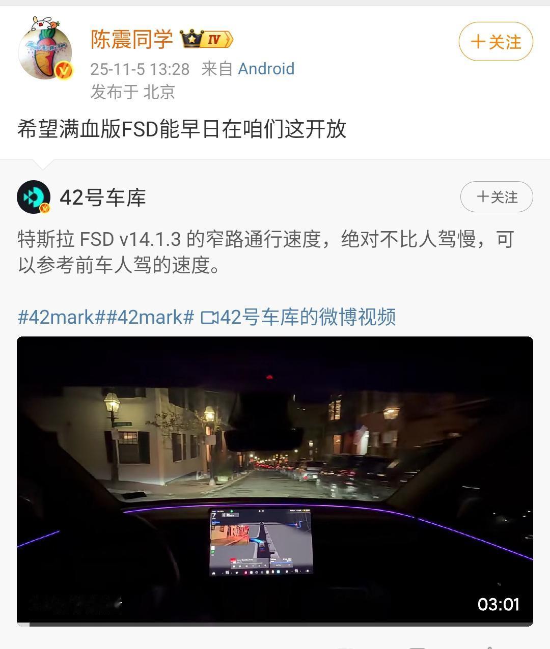 陈震:希望满血版FSD能早日在咱们这开放! 虽然特斯拉国内版的表现不咋地,但是国外版的表现确实可以,陈震都希望尽早的引入国内进来! 现在国外版测试的视频越来越多了表现还可以,至少像一个正常人开车的水平,这可以大幅度减轻驾驶员的疲劳。 各位是怎么看的?欢迎评论区留言。