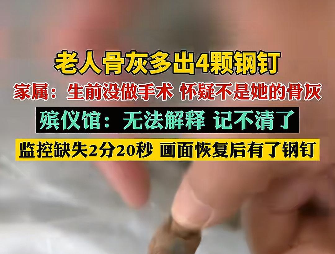 有人知道这是为什么吗? 一位去世老人火化出来之后,亲属发现骨灰中多了四颗钢钉! 家属觉得很奇怪,因为老人在生前从来没有做过手术,怎么可能平白无故多了几颗钢钉呢?所以亲属就怀疑是不是弄错了? 当这件事反映给殡仪馆后,殡仪馆推卸责任,说他们什么都不知道,每天那么多去世的老人,记不清楚了! 更巧合的是,调取监控时,恰好火化老人的那两分钟监控坏了,画面缺失,两分钟后监控好了,骨灰里就多了几颗钢钉。 监控这玩意,我发现特别奇怪,一年三百六十五天都不坏,一有事就坏。 老人的骨灰里为什么会多几颗钢钉呢?难道是弄错了吗? 大家觉得是什么原因?还是有什么不可告人的秘密吗? 欢迎评论区留言!