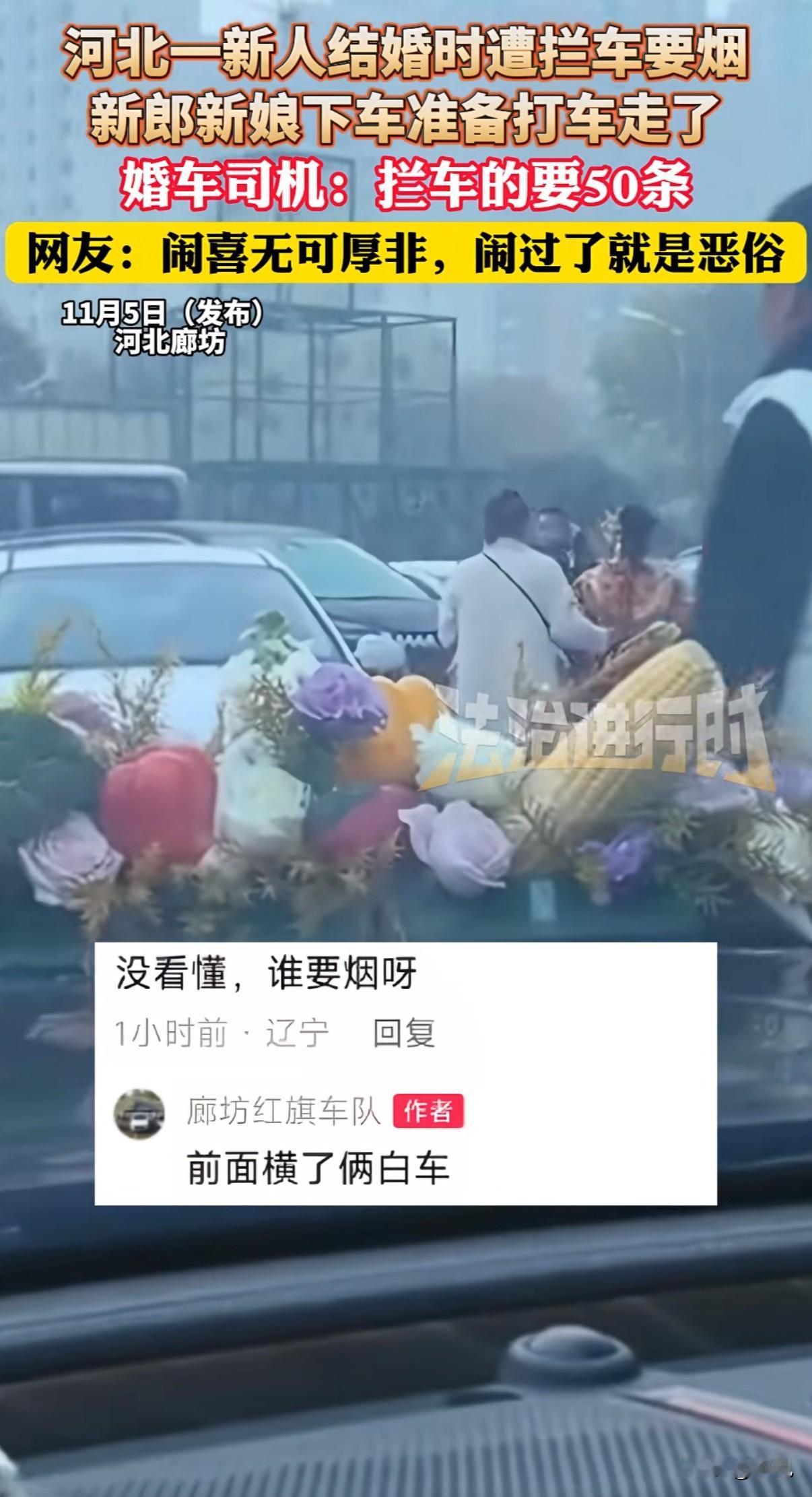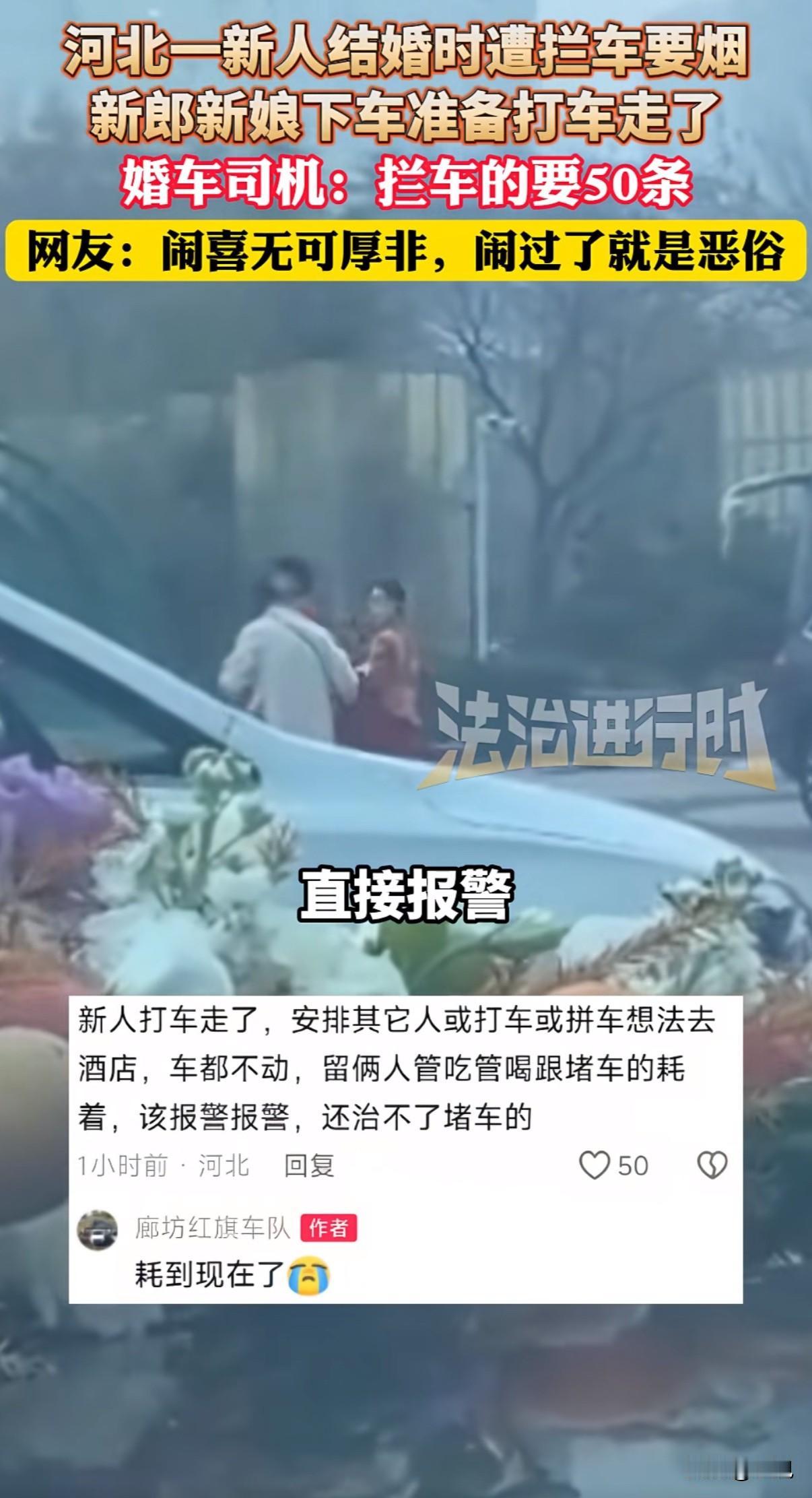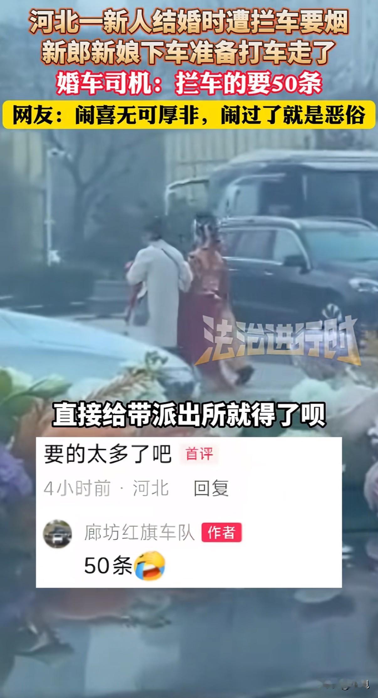 河北廊坊一对新人,结婚当天被一群人拦下婚车。对方开口就要50条烟,少一条都不让走。僵了快一个小时,新郎新娘没办法,干脆下车打车走了。婚车司机后来证实:“确实要50条,这闹喜闹过头了。” 现场目击者说,新人因为时间紧,没选择报警。但这事搁谁身上都堵心。结婚是大喜日子,谁想闹得这么不愉快? 其实不止廊坊,其他地方也有类似情况。 陕西某地,有人拦婚车直接要20条中华烟,价值近万。最后十多个伴郎一起把车抬到路边,婚车才勉强通过。 更让人哭笑不得的是,有些拦车的还是熟人。听说有个案例,拦车要烟的人居然是新郎父亲的朋友。 从什么时候开始,闹喜从要点喜糖、散几根烟,变成了按条计算?50条烟,算下来起码四五千块钱,这已经不是图喜庆,而是图钱了。 为什么会出现这种情况? 一方面,有人觉得结婚日子特殊,新人不会计较,趁机占点便宜。 另一方面,从众心理作祟,看到别人这么要也没事,就跟着学。 还有一点,很多新人选择忍气吞声,怕耽误吉时,反而助长了这种风气。 面对这种情况,新人其实有几个选择: 提前规划路线,避开常有人拦车的地段; 遇到过分要求,果断报警处理; 像廊坊那对新人一样,换个方式离开,不跟他们纠缠。 结婚是人生大事,闹喜是传统习俗,但任何习俗都不能成为勒索的借口。真正的祝福,应该是让新人开心,而不是给他们添堵。 传统习俗需要与时俱进,那些变味的“闹喜”,是时候该改改了。好在现在越来越多年轻人敢于对过度婚闹说“不”,这就是个进步。