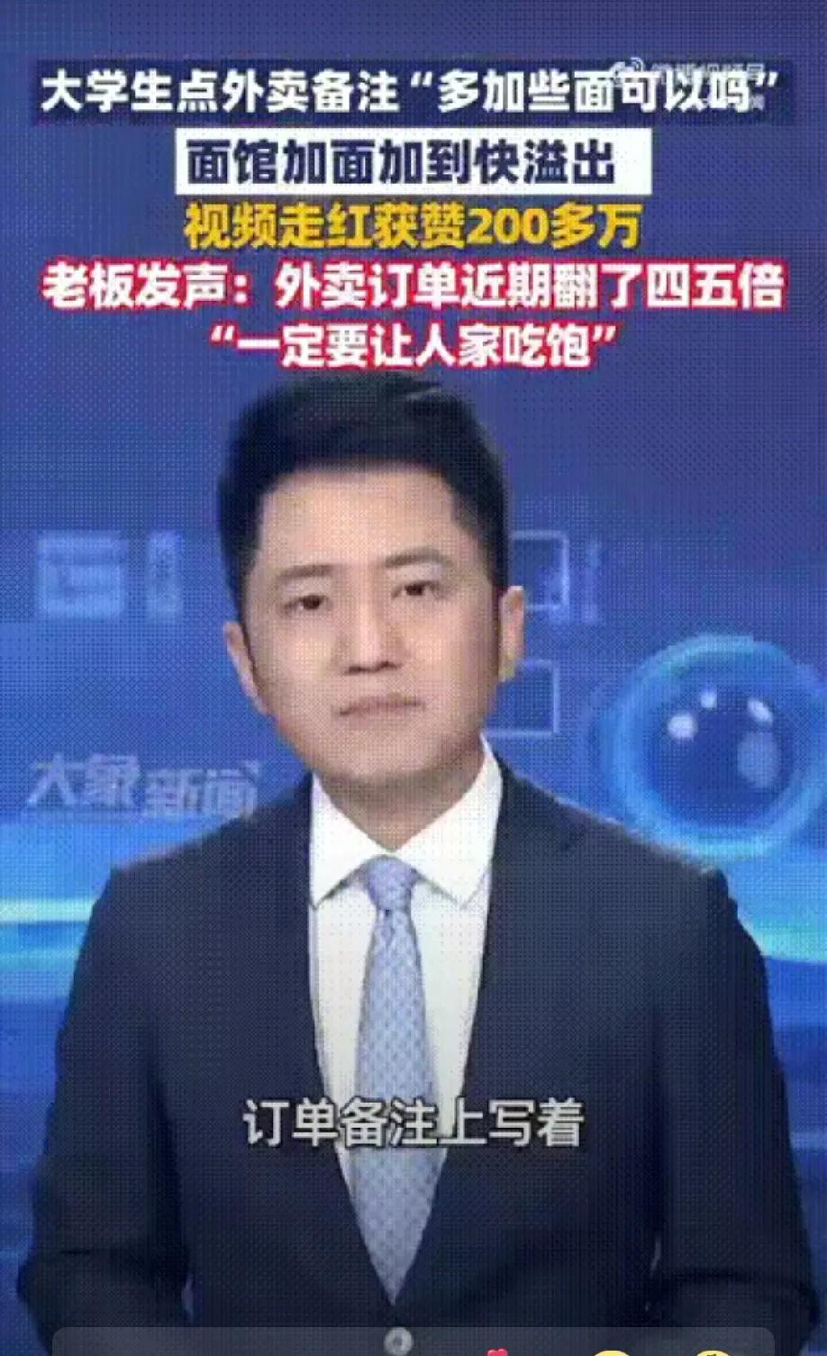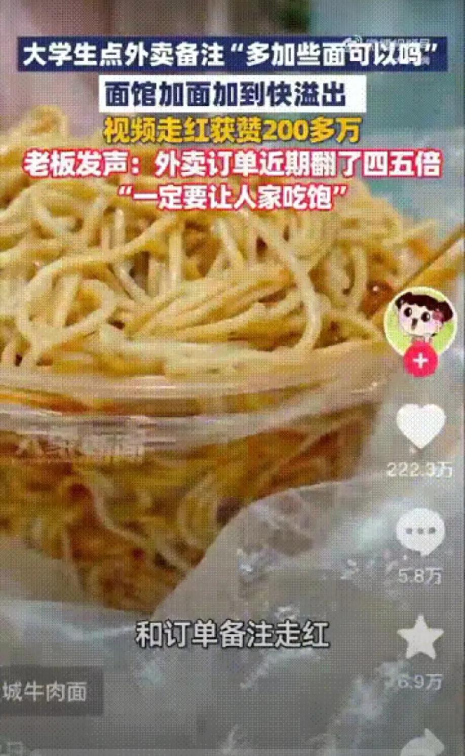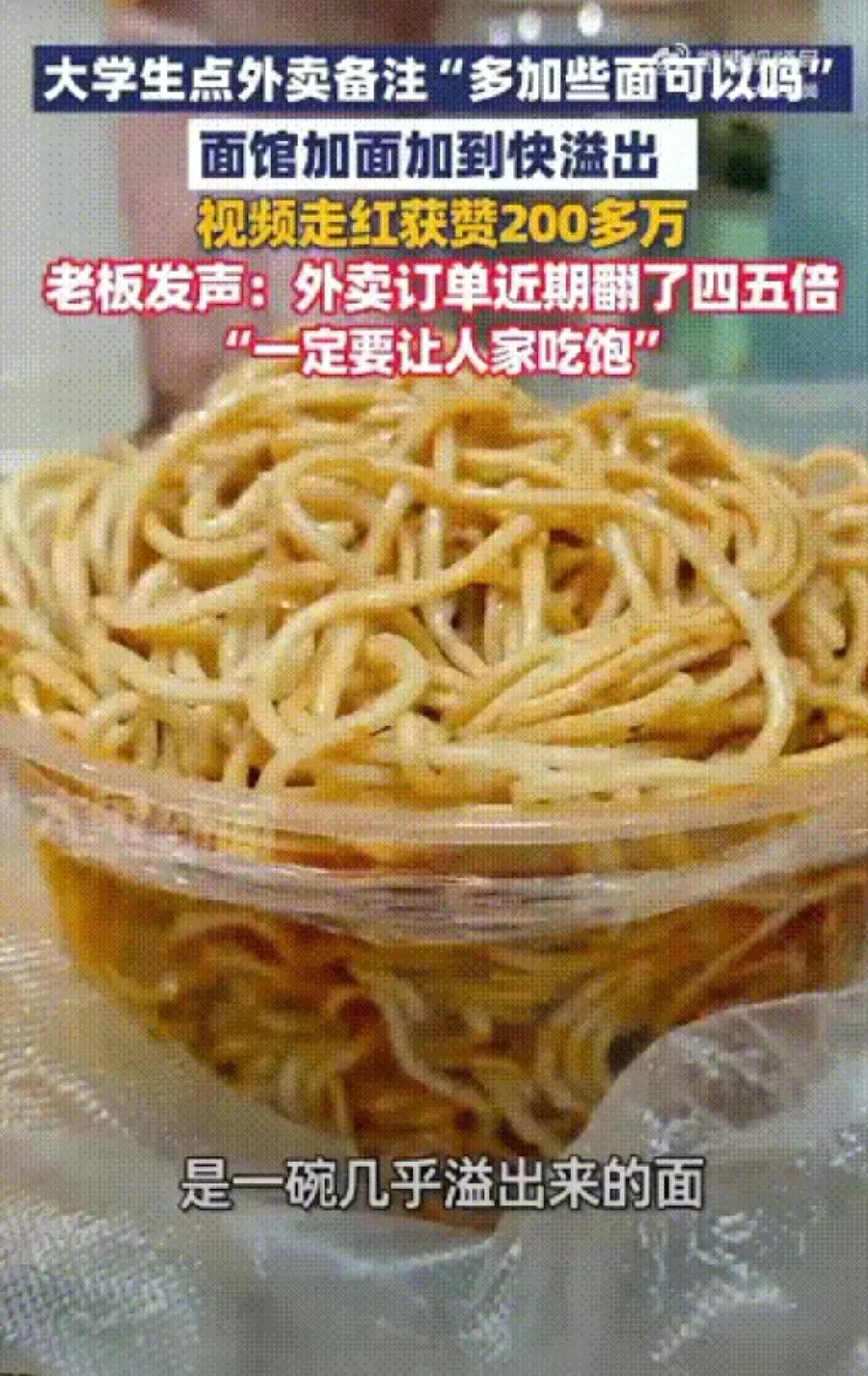 这哪是加面,这简直是老板把格局和善良都加满了! 一个大学生的随口一句"多加点面",老板直接给加到"溢出来",这份实在和真诚,难怪能让生意爆火。这背后其实藏着一个很简单的道理:真正的成功,往往源于超越利益的善意。 在这个追求效率和利润的时代,这位老板没有把顾客当成单纯的"消费者",而是像对待朋友一样,用一碗满满的面传递着温暖。他的"格局"不是什么高深的商业策略,而是最朴素的"一定要让顾客吃饱"的初心。 这份善意被大学生记录并分享,迅速在网络上引发共鸣。大家为老板点赞、去店里消费,本质上是在为这份久违的真诚买单。这印证了那句老话:你只管善良,上天自有安排。