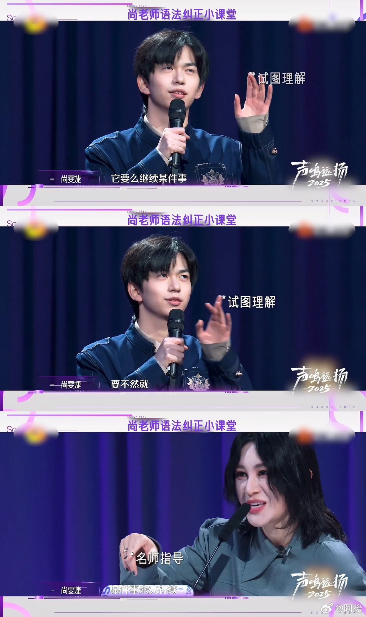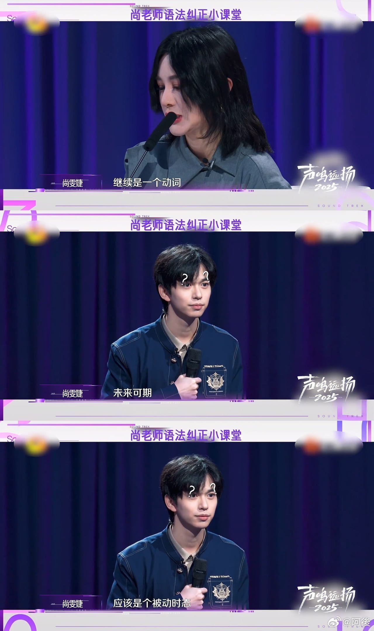 尚雯婕 这个语法忍不了一点看音综被尚雯婕笑到捶桌!选手魏忠杰一句“to be continue”,姐直接打破励志氛围,化身严厉语法老师,连被动时态都讲得明明白白,这执念也太可爱了!