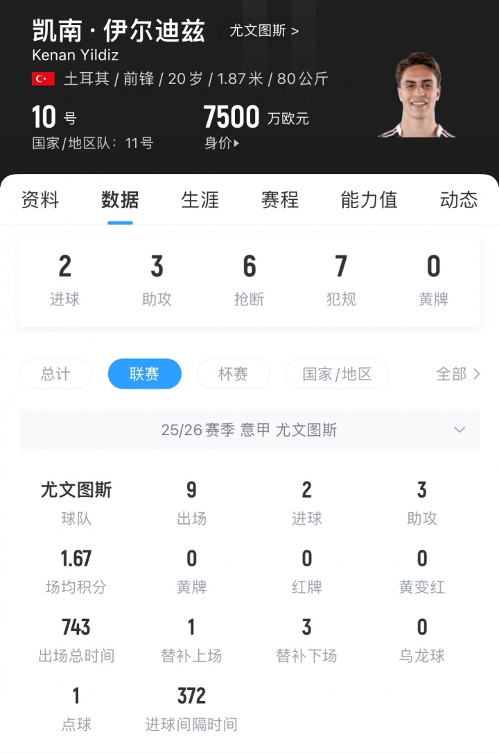 伊尔迪兹现年20岁,司职左边锋,目前球员德转估值7500万欧,与尤文现有合同在2029年到期。本赛季,伊尔迪兹为尤文出战13场比赛,贡献3球4助。