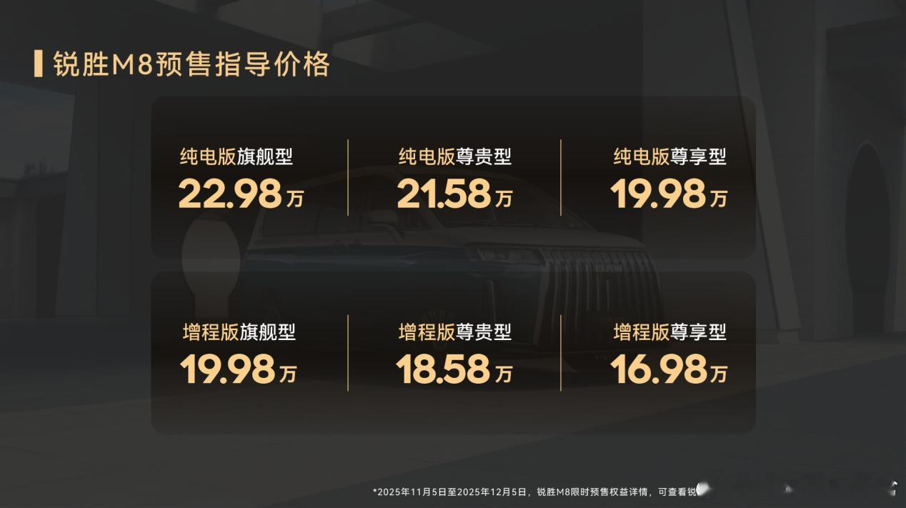 锐胜M8开启预售 11月5日,作为北京汽车制造厂旗下专注MPV赛道的独立品牌,锐胜汽车在青岛召开锐胜M8预售发布会。该车提供燃油、增程、纯电以及CNG多种动力版本供选,共推出6款车型,预售区间为16.98-22.98万元。