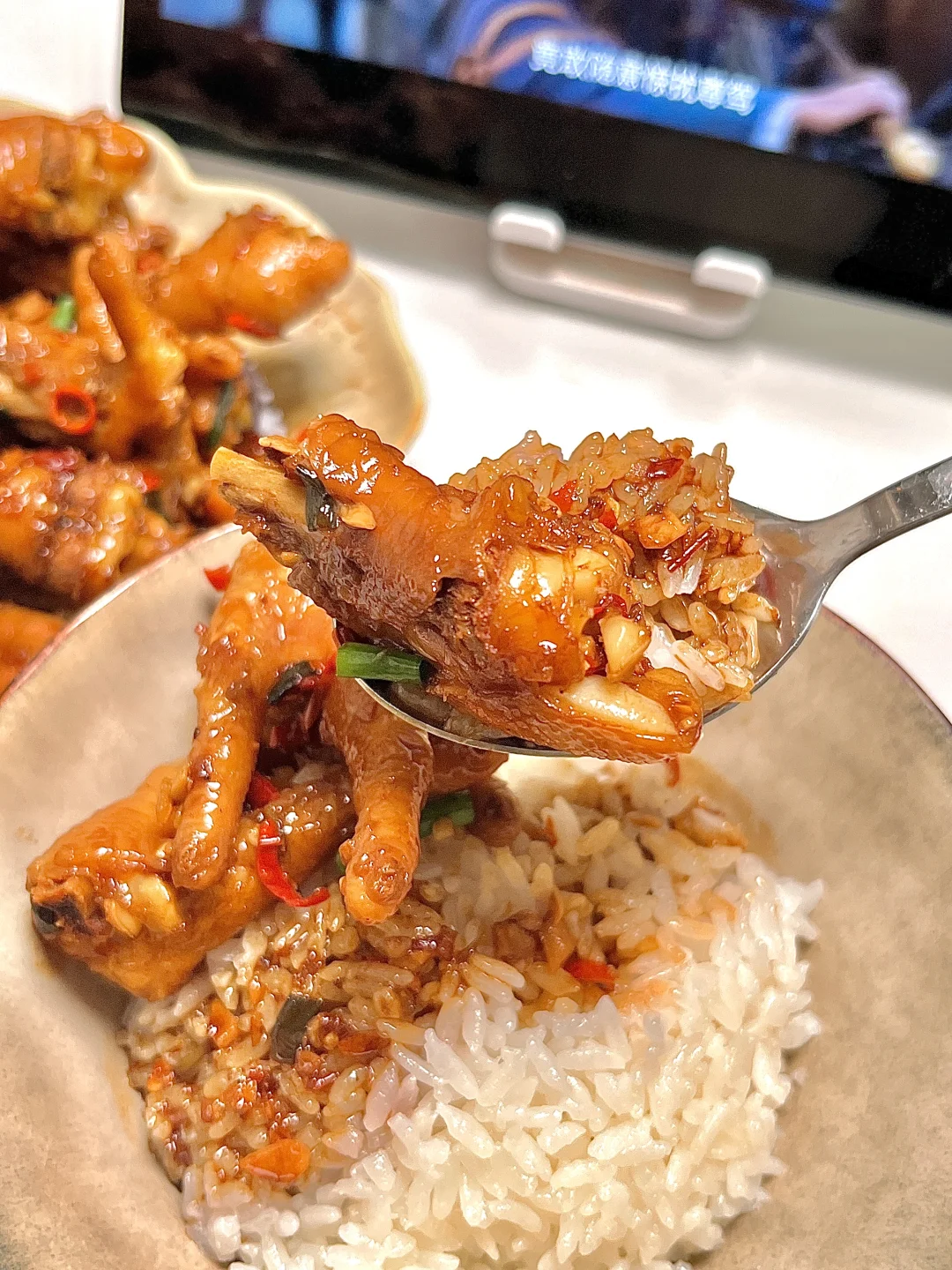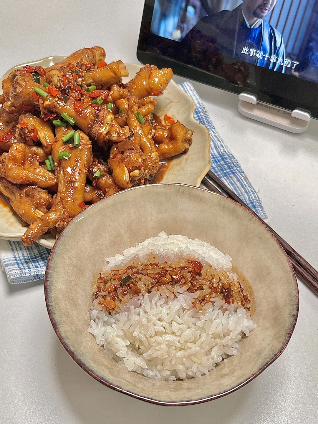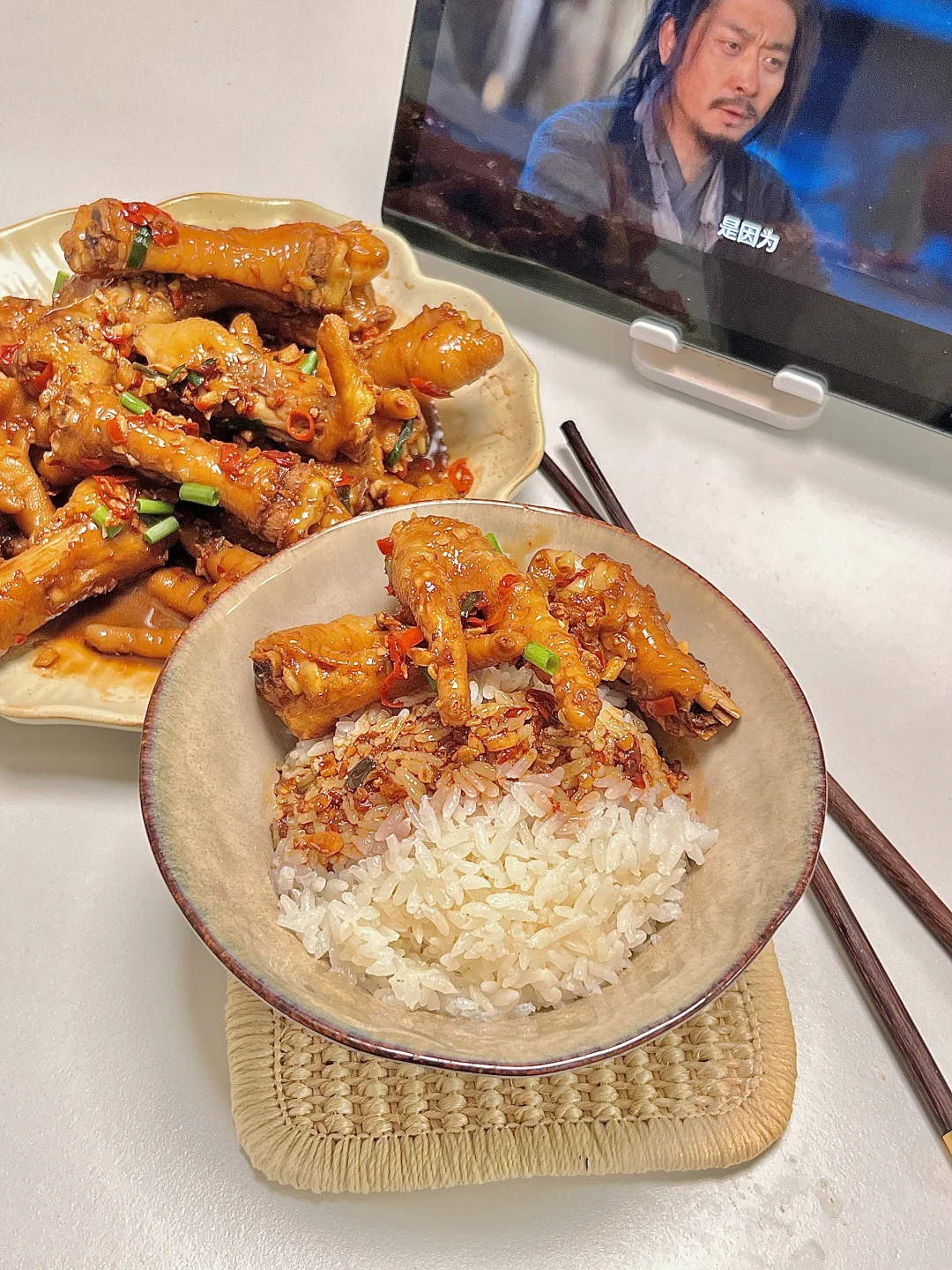 夏日消暑风味集 🍴今日份一人食: 辣炒鸡爪饭 冷萃绿茶🍵 . 如果你也爱吃鸡爪,那不要错过这个辣炒鸡爪了,软糯脱骨,嗦的停不下来[棒R]浓郁醇厚的酱汁浇盖在米饭🍚上,谁吃都得香迷糊了~爱吃的宝子一定要试试呀✌🏻