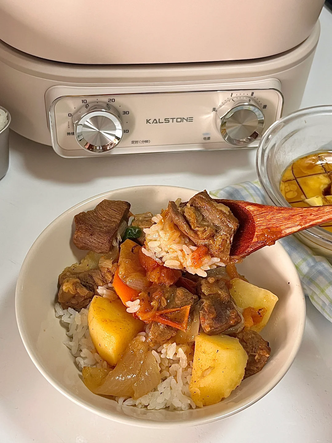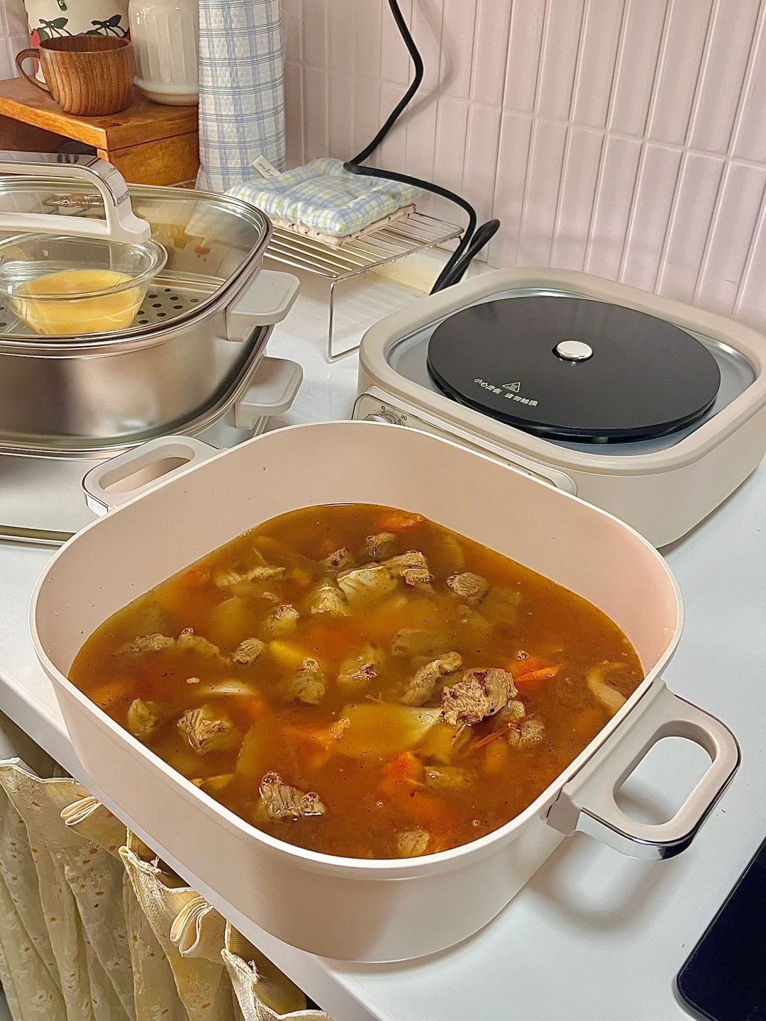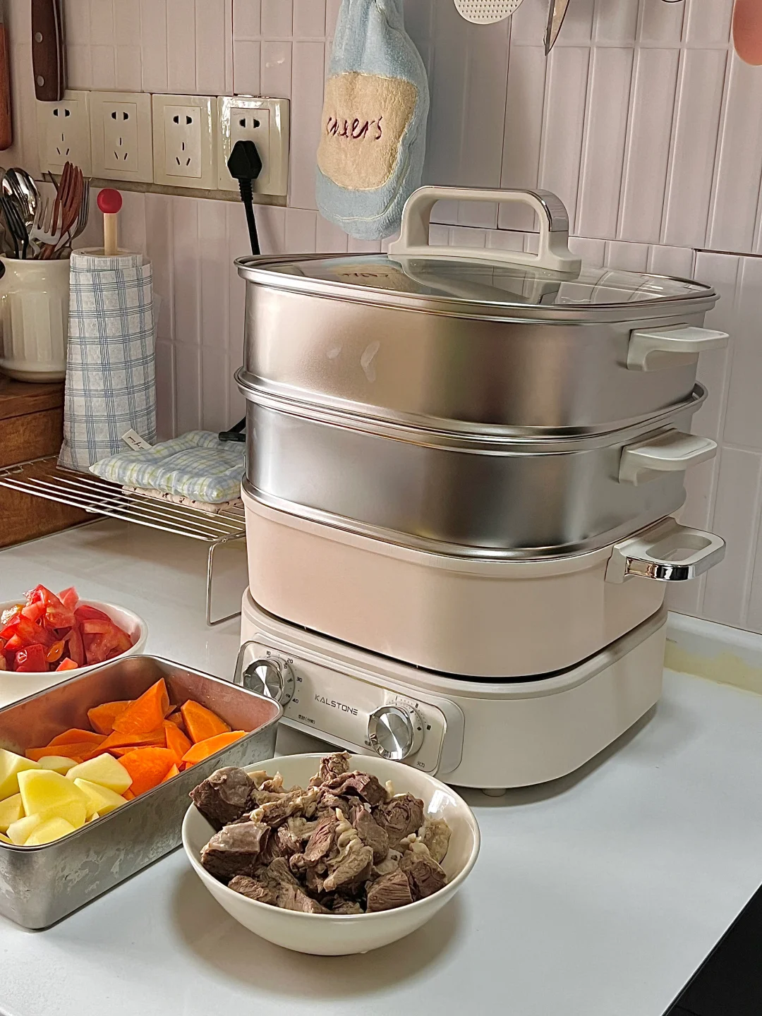 今天晚餐长这样 今日份二人食: 番茄🍅土豆炖牛肋条🥩 鸡蛋羹&玉米🌽 ~ 吃健康蒸煮食物🫕真的会很舒服~ 图片上 主食 俩菜都是一锅出,省时省力~ 新入的做饭好搭子、巢石N1多功能料理锅,不仅颜值在线,实用度也很高,双层蒸格 平时蒸米饭🍚蒸菜一锅就出。有定时功能 全程免看火 省时省心~ 6L大容量无论是做一人食还是聚餐都够用。还是蛮实用的! 做法看图片⬆️~