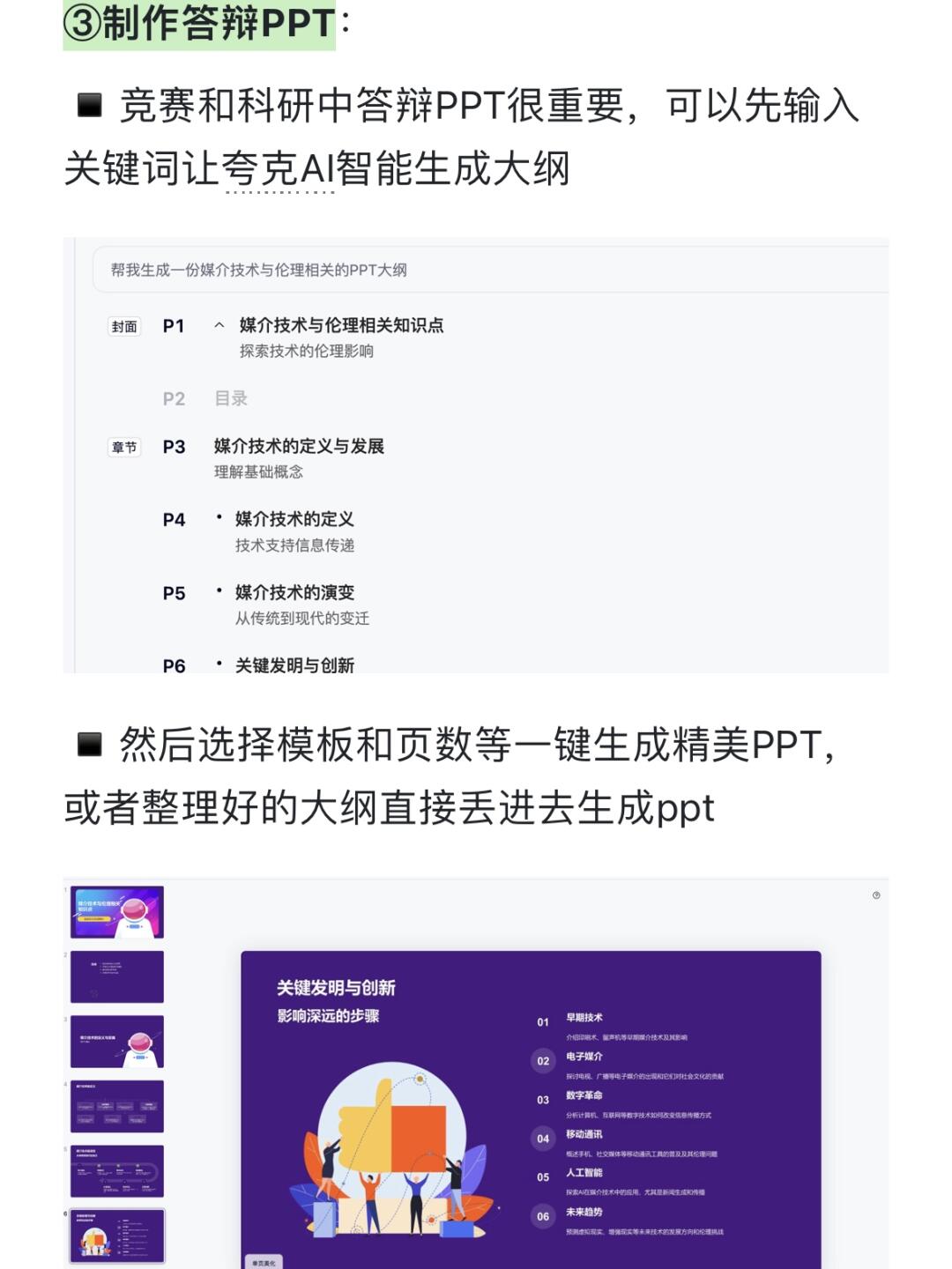 ③制作PPT:先输关键词让夸克AI智能生成大纲,再选模板页数一键生成精美PPT,或整理好大纲丢进生成pptai软件 夸克 夸克app 夸克ai搜索 ai 大学生 文心一言 蒲公英优质笔记激励计划2 .0
