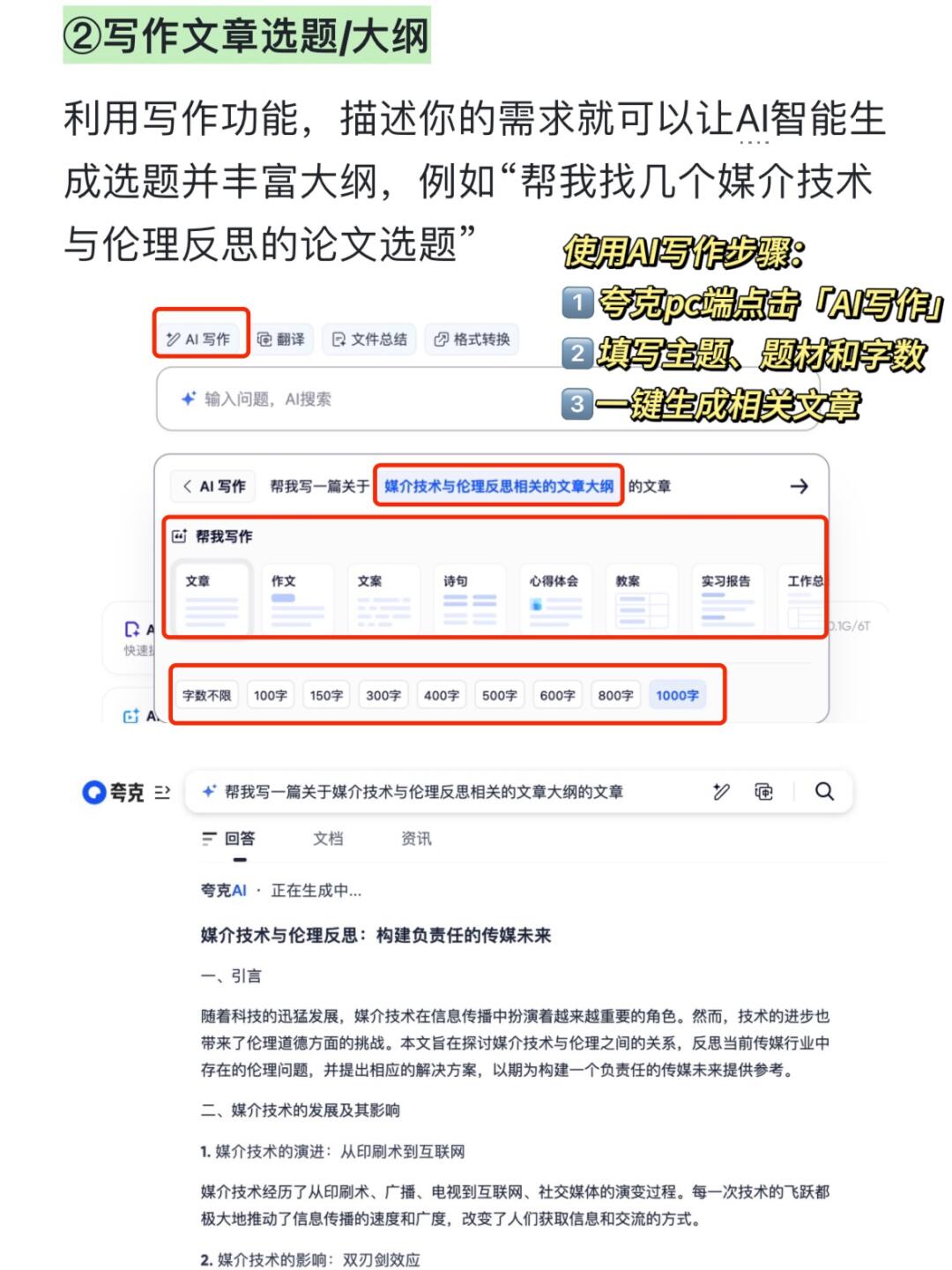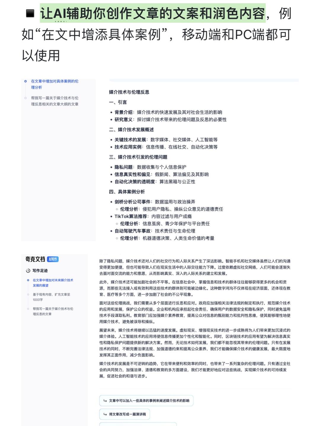②创作文章:利用写作功能,描述需求让AI智能生成选题+丰富大纲,支持多种文章类型与字数要求创作;例如“帮我找媒介技术与伦理反思选题”,ai软件辅助创作文章和润色,多维度辅助用户再创作,例如“在文中增添具体案例”,移动和PC端都可使用