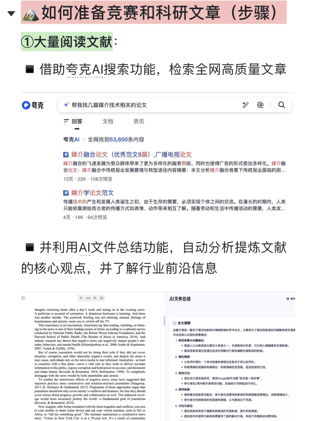 ①大量阅读文献:借助夸克的AI搜索功能,检索全网高质量文章,用AI文件总结功能分析提炼观点+了解前沿信息