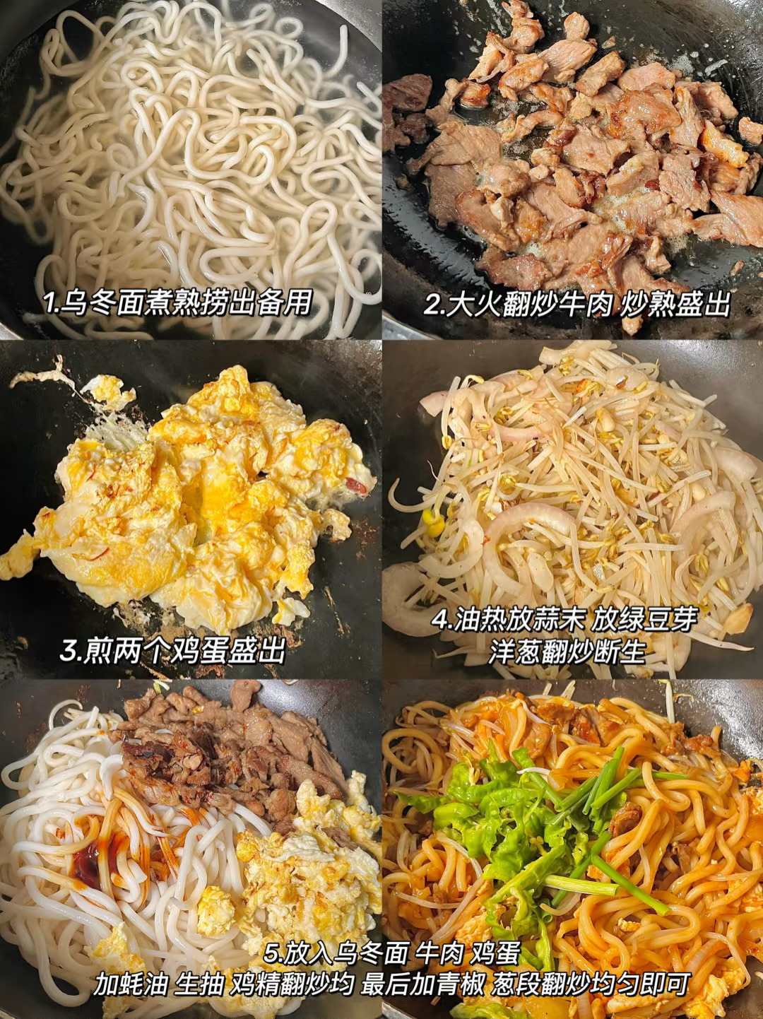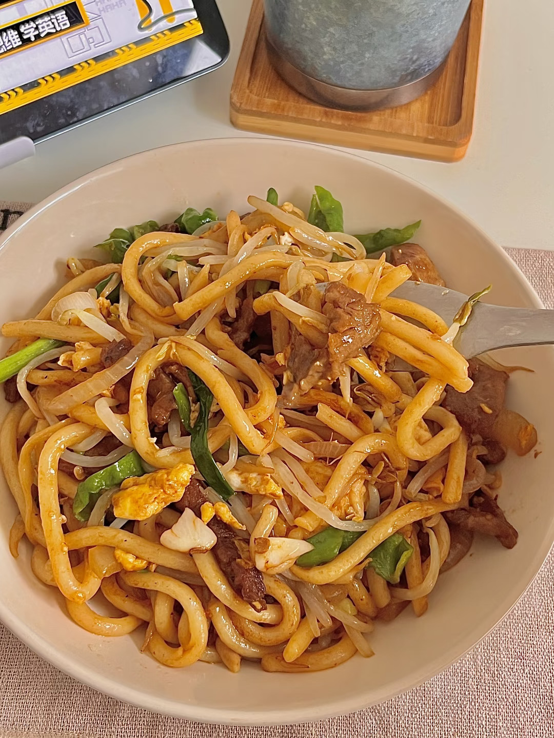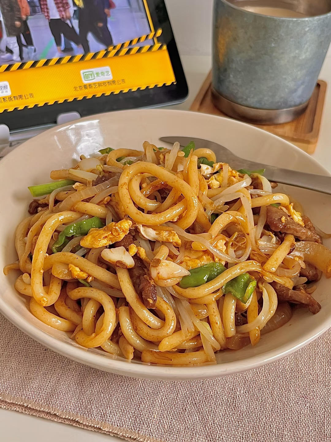 🍴今日份一人食: 牛肉炒乌冬面 拿铁 . 没人能拒绝牛肉炒乌冬面吧~软糯Q弹的乌冬面和嫩滑牛肉、焦香鸡蛋、爽脆豆芽配一起实在是太好吃了😋 再放些青辣椒🌶️辣辣的更香啦~爱吃的宝一定要去试试呀✌🏻