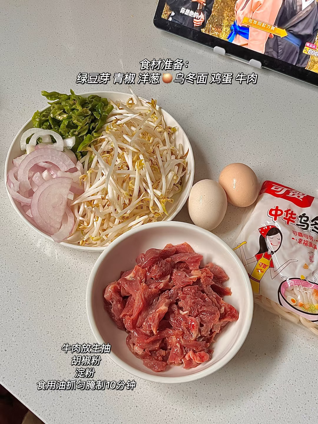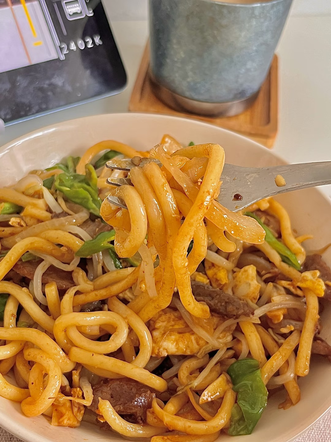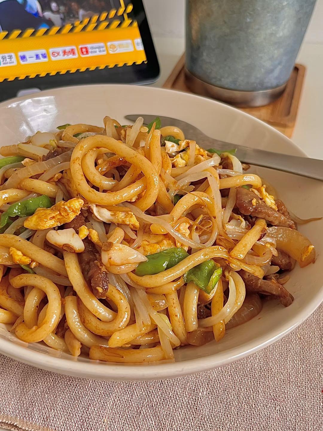 🍴今日份一人食: 牛肉炒乌冬面 拿铁 . 没人能拒绝牛肉炒乌冬面吧~软糯Q弹的乌冬面和嫩滑牛肉、焦香鸡蛋、爽脆豆芽配一起实在是太好吃了😋 再放些青辣椒🌶️辣辣的更香啦~爱吃的宝一定要去试试呀✌🏻