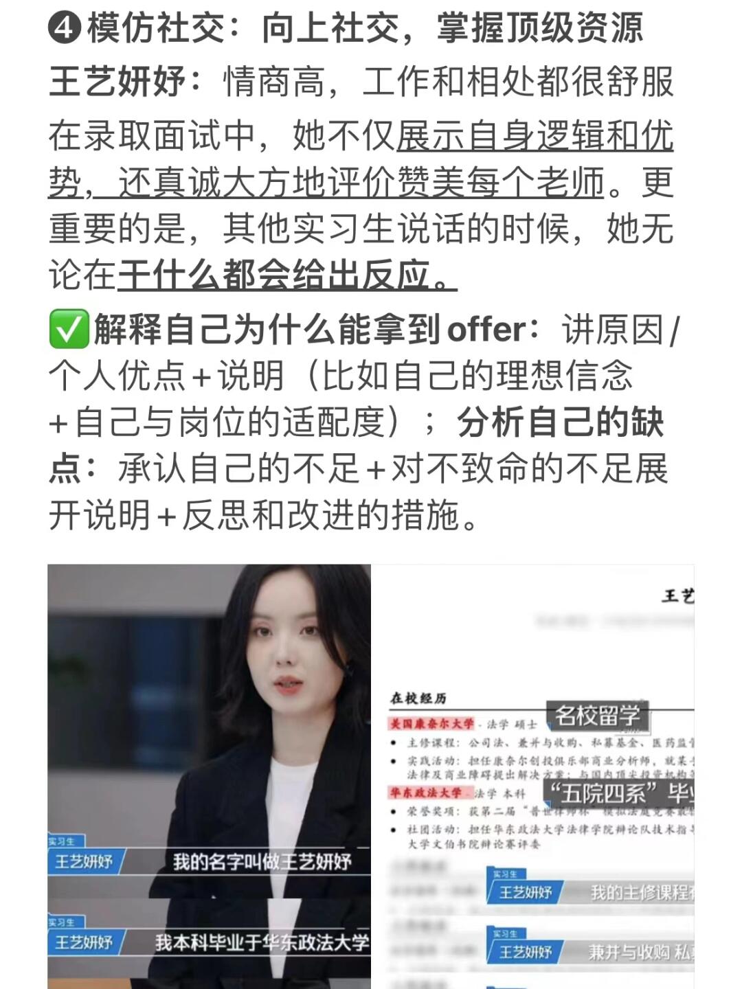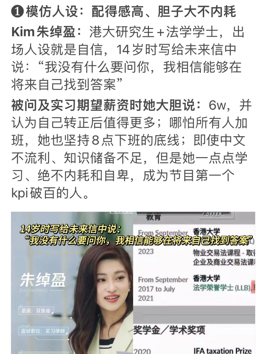 这季offer5干货满满,看完后我发现:真正的强者都是相似的,慕强的唯一出路是成为强者。9个实习生从普通学生,到成为职场强人,他们身上有太多特质,值得我们普通大学生用1年时间去模仿 . ❶模仿人设:配得感高、胆子大不内耗 Kim朱绰盈:港大硕士,出场人设就是自信 大学潜规则就是撑死胆子大的,饿死胆子小的。①当被问期望薪资时,她大胆说:6w,并觉得转正后值更多; . ②即使中文不流利、知识不足,但她绝不内耗,一点点学习,成为第一个kpi破百的;③14岁写给未来的信:“我没有什么要问你,我相信能够在将来自己找到答案” . ❷模仿执行力:聚焦目标,以结果为导向 许文婷:法大研究生+海外交流 她执行力惊人,有目标后不犹豫,效果好就优化,效果不好就复盘;做事以结果为导向,汇报时面对实力更强的王艺妍妤,依然保持重点逻辑 . 🔻提高执行力的书 ①掌控习惯:8.5 ②认知觉醒:8.1 ③刻意练习:8.0 ④金字塔原理:8.1 . ❸模仿认知:内核稳定,不与他人比较 黄凯:出身农村,五战上岸清华 他身上不止努力,还有内核稳定,清醒知道要什么。五次考研4次失败,依然坚持跨考;节目中没拿被录取,但他知道上节目为什么:只要有一个课题让自己满意就好了 . 🔻提高认知节目 ①十三邀:9.3 ②圆桌派:8.8 ③非正式会谈:9 ④杨澜访谈录:7 . ❹模仿学霸社交:向上社交,掌握顶级资源 王艺妍妤:情商高,工作和相处舒服 在录取面试中,她不仅展示自身优势,还真诚大方赞美老师。更重要的是,当其他实习生说话时,她无论在干什么,都会给出反应 . 这种完美社交情商,让我想起名校学霸朋友,除了生活中很会相处, 还很会维持社交关系:每次过节都为老师和伙伴准备新鲜特产,而不是等用人时再维持关系送礼 . 我深受启发,但又怕当面送礼尴尬,幸好发现顺丰同城第三方送礼,大大减少i人怕被拒的尴尬,也提高送礼成功率。给大家安利一下顺丰同城【1小时同城急送】,除了速度快,商务送礼选顺丰同城,大品牌更有面子,不仅避免尴尬,也更能传递对别人的心意。而且它的“安心送”,100%保价全赔,送礼也有保障,不担心礼物丢失损坏,快学起来吧