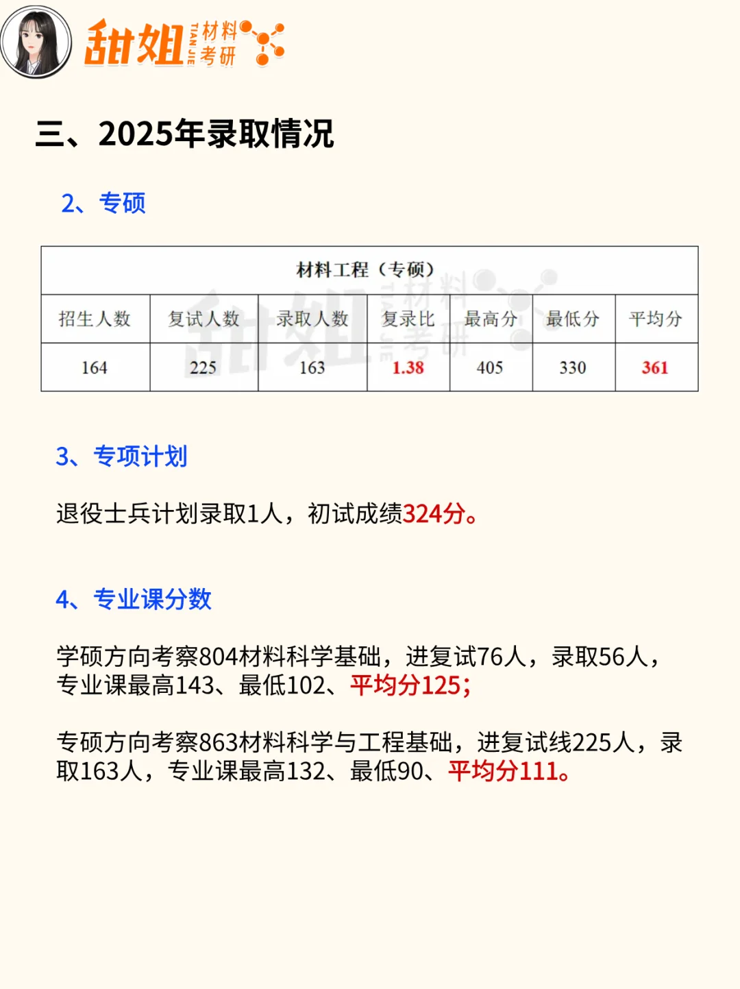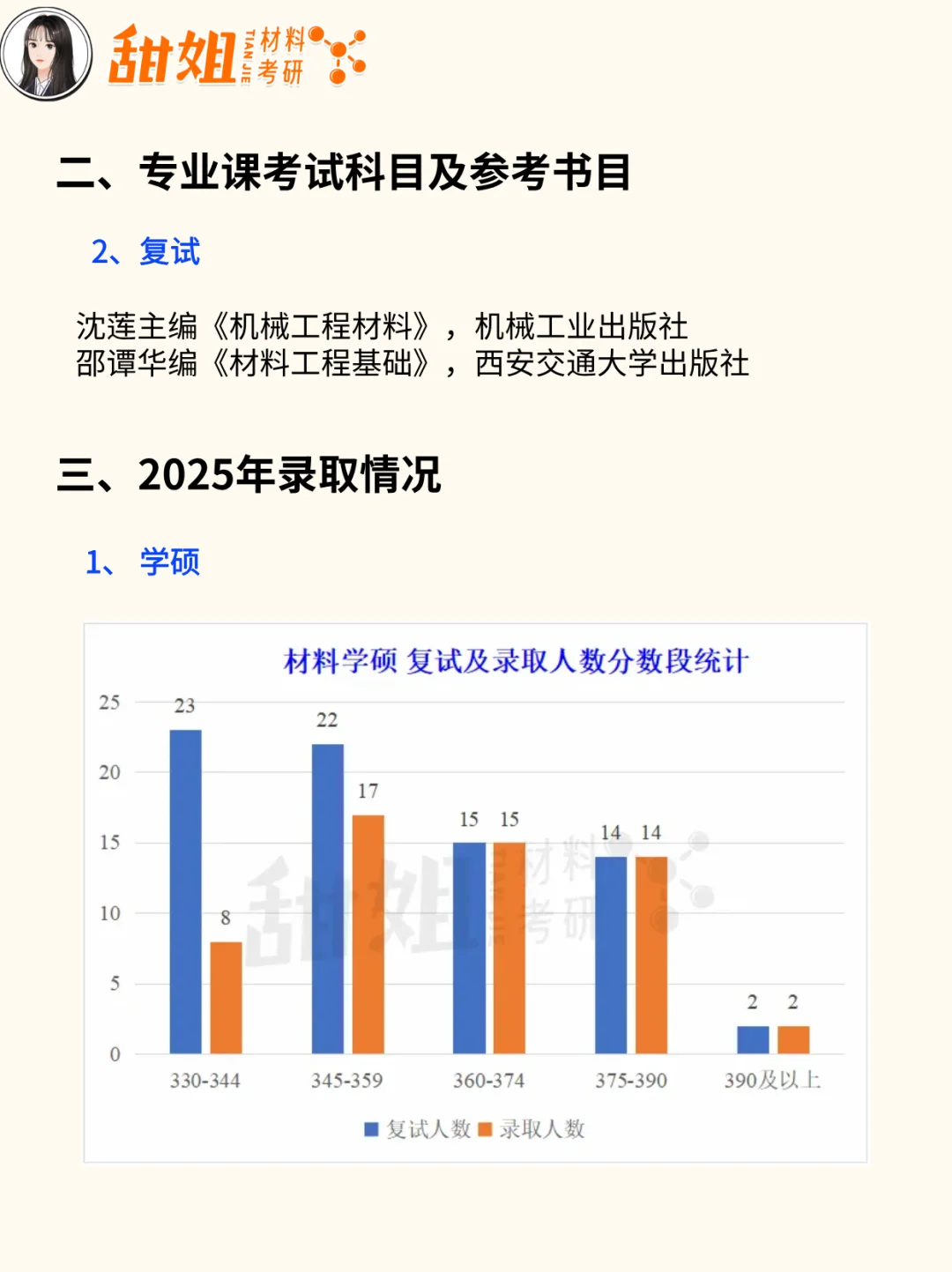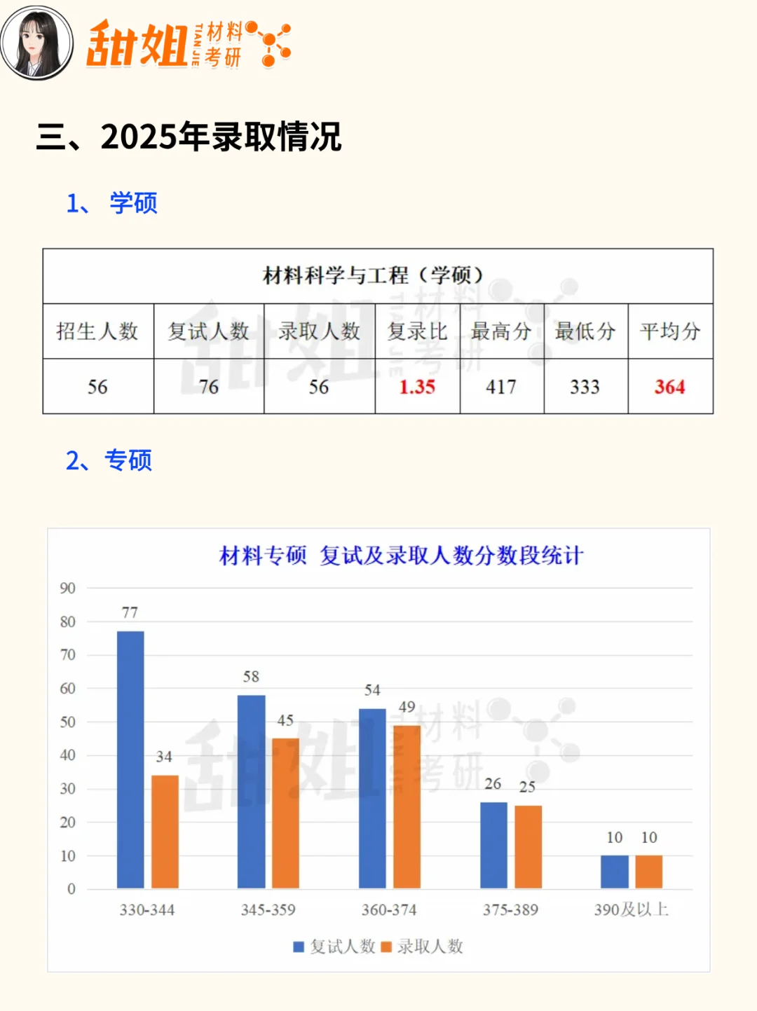 相对而言专硕考察内容更多、难度也更难,专业课均分也印证这点,学硕平均分125、专硕平均分111。但是在复试考试科目中,学硕也要考察《材料工程基础》这本书。