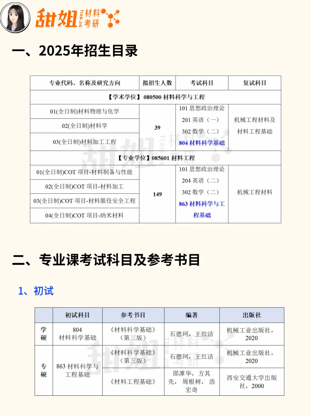 专业课方面,初试西交大学硕考察804、专硕考察863,两者都考《材料科学基础》,但专硕多一本《材料工程基础》。