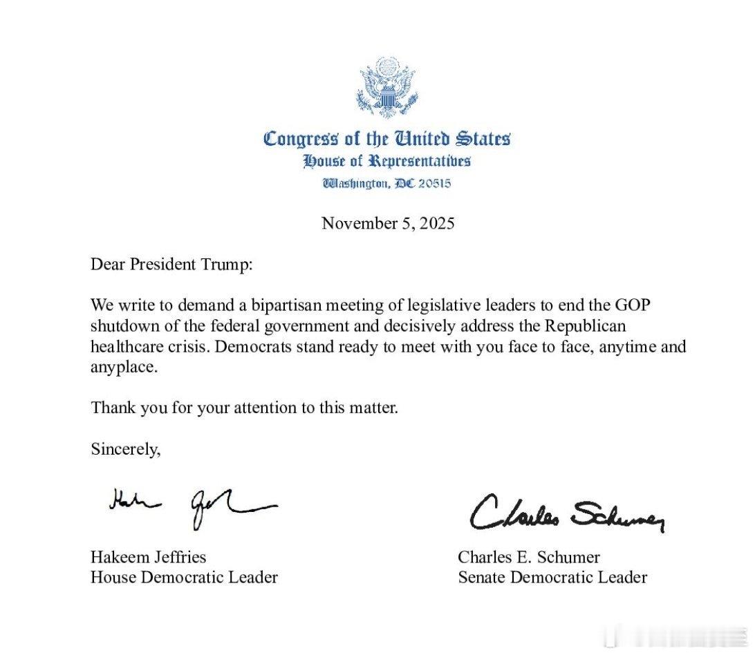 民主党参众两院领袖,联合致信总统:我们随时随地,愿与你面谈,如何结束政府关门、解决医保危机