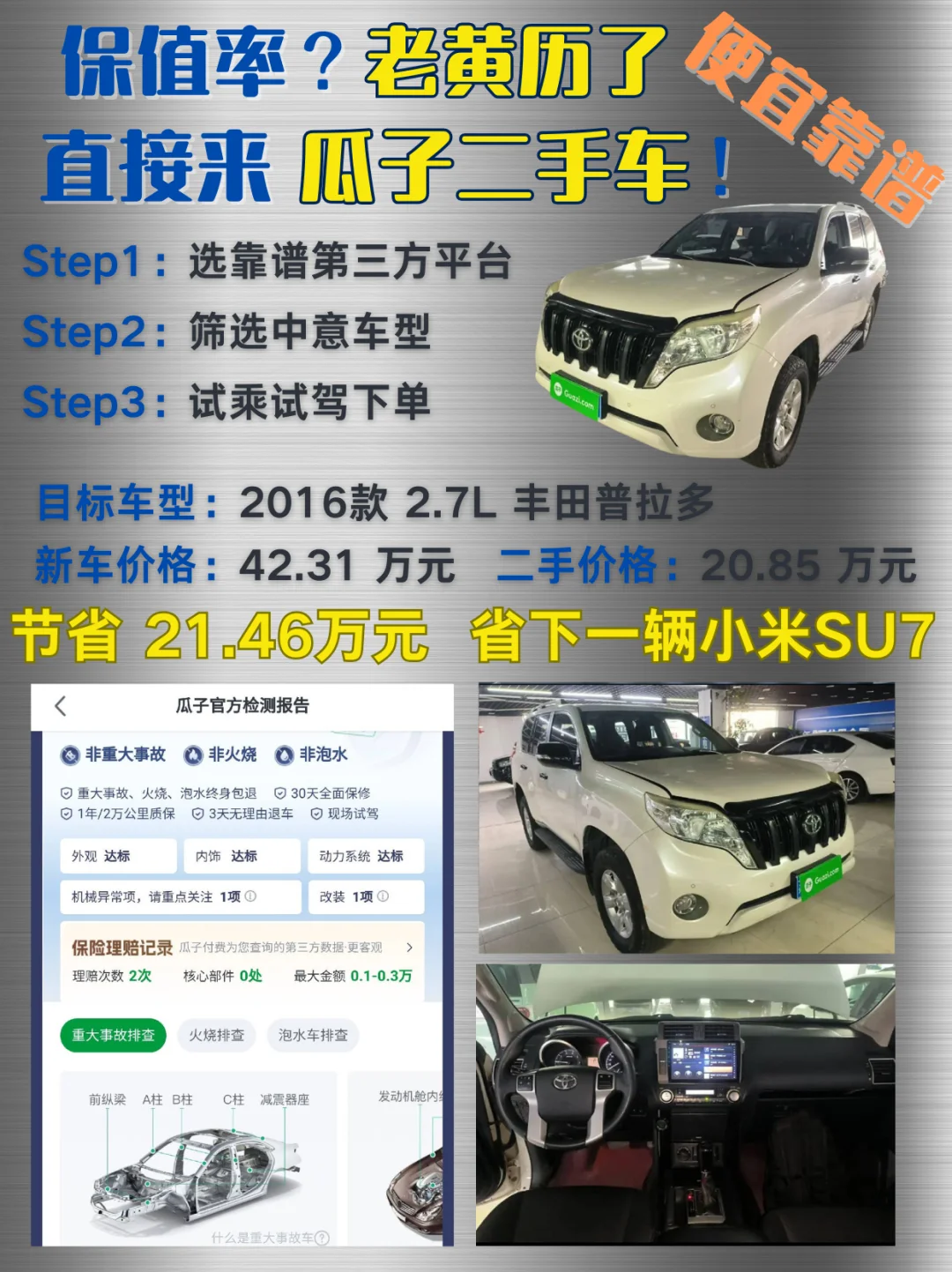 就拿我家来说吧,在瓜子二手车上买了一辆 2016 款的丰田普拉多,原价含税 42.31 万呢,在瓜子上只要 20.85 万就拿下啦,直接省出一辆小米 su7 的钱!😍