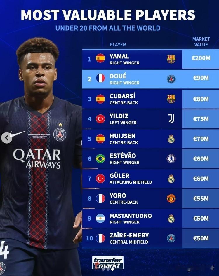 镇压了一个时代,亚马尔2亿身价横扫足坛U20球员! 近日,《德国转会市场》盘点统计了足坛U20球员身价排行榜榜,其中亚马尔以2亿欧元身价遥遥领先排名第一,排名第二的则是刚刚拿到金童奖的杜埃,身价只有9000万欧元。 至于排在后面的库巴西,伊尔迪兹,赫伊森,埃斯特旺,居莱尔,约罗,马斯坦托诺和埃梅里等,放在其他时代也都是独当一面的天才,可惜却和亚马尔生在了同一时代,注定会成为陪衬。 就像叶天帝一样,同时期无数绝世天才都被压制的死死的,最终成为天帝的只有叶凡。