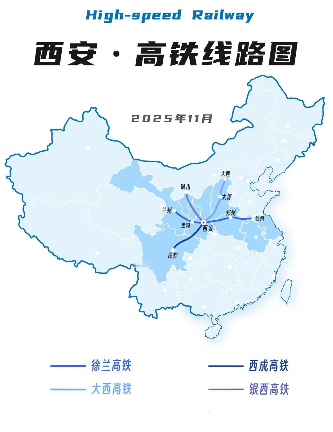 西安 高铁线路分布图 📍手绘西安高铁线路网,图1含在建未通车线路,图2为已通车运营线路~ 1️⃣徐兰高铁:连接徐州和兰州,《中长期铁路网规划》(2016年版)中“八纵八横”高速铁路主通道之一“陆桥通道”的重要组成部分,2017年全线通车,其中徐州宝鸡段设计时速350公里,宝鸡兰州段设计时速250公里; 2️⃣西成高铁:连接西安和成都,“京昆通道”的重要组成部分,2017年底全线通车,设计时速250公里; 3️⃣银西高铁:连接西安和银川,“包(银)海通道”的重要组成部分,2022年年底全线贯通,设计时速250公里; 4️⃣大西高铁:连接西安和大同,“京昆通道”的重要组成部分,2014年西安至太原段通车,2024年底全线贯通,设计时速250公里; 5️⃣包西高铁:连接包头和西安,“包(银)海通道”的重要组成部分,整体分为西延、延榆、包鄂榆三段推进,西延高铁预计2025年底建成通车; 6️⃣西武高铁:连接西安和武汉,设计时速350公里,武汉十堰段已于2019年建成通车,西安十堰段目前仍在建设中; 7️⃣西渝高铁:连接西安和重庆,京昆通道组成部分,分西康段和康渝段两段建设,设计最高速度350公里,目前仍在建设中~ 手绘地图 地图 高铁 高铁线路图 西安 西安高铁 坐着火车去旅行 徐兰高铁
