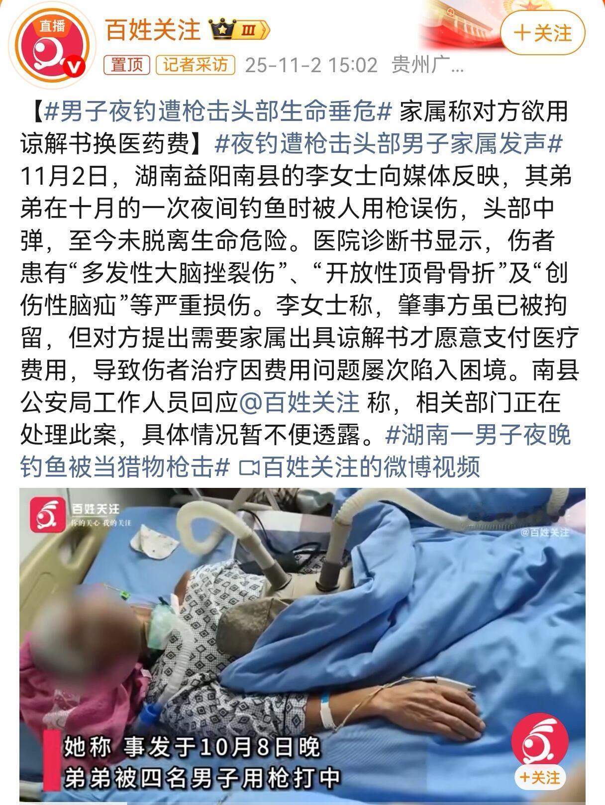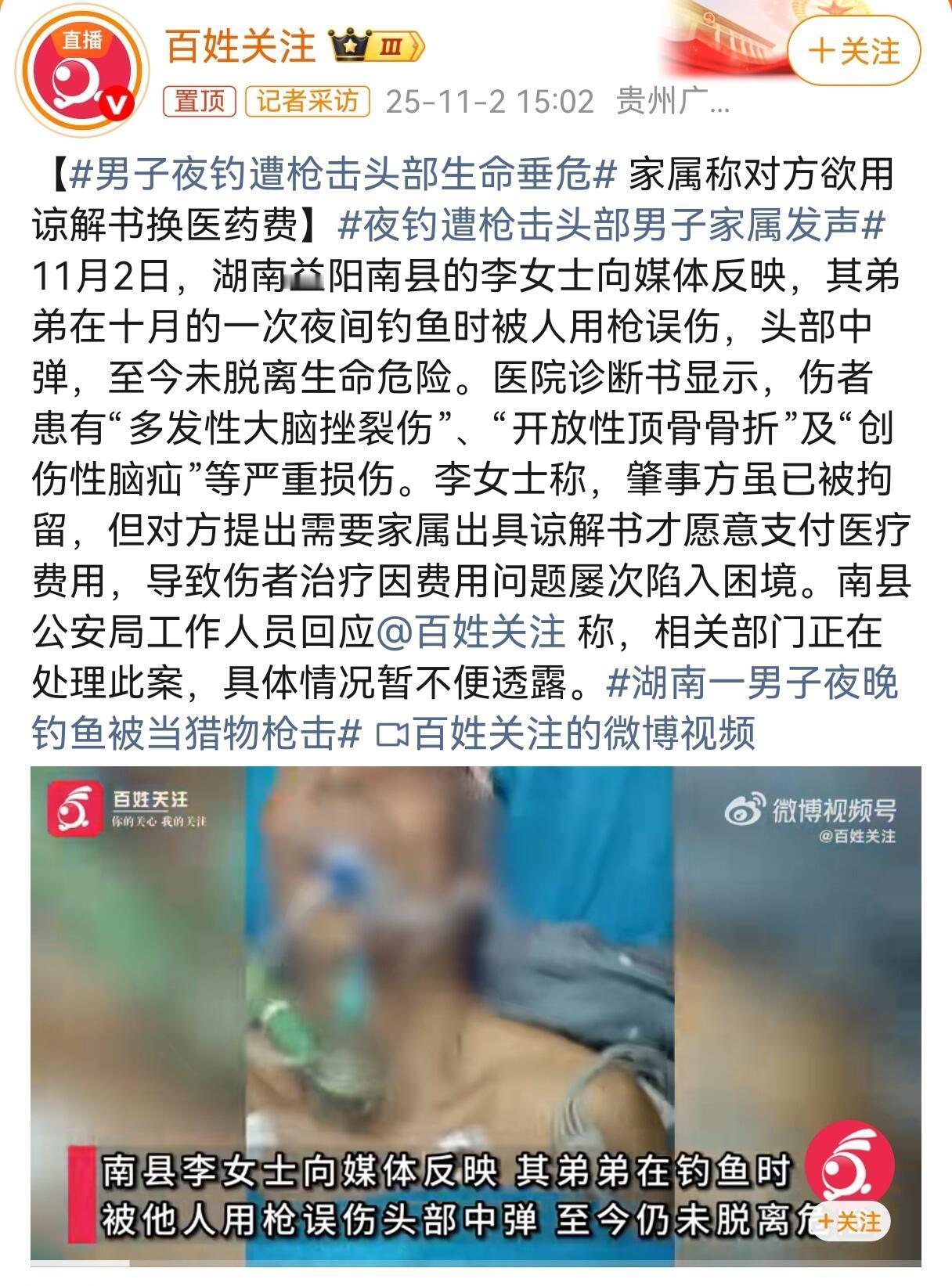 这事儿听着就吓人——湖南南县有个男的晚上出去钓鱼,结果被一伙打猎的当成猎物,一枪打中脑袋,现在人还在医院里躺着,情况特别危险。 他姐姐说,当时她弟弟就蹲在草丛边上,估计是那四个打猎的夜里眼神不好,直接把他当野物给打了。现在这四个人已经被警察抓了,案子也转给了刑侦队去查。 现在问题来了:那几个人说是“误伤”,说自己看错了。按法律上的说法,这叫“对象错误”,就是本来想打A,结果看错了打到B。但你说这能算理由吗?黑灯瞎火拎着枪出去打猎,看见黑影就扣扳机,这跟闭着眼乱开枪有啥区别? 要我说,这事儿根本不是一句“看错了”就能糊弄过去的。你手里拿着枪,那就得对每一颗子弹负责。哪怕打中的真是动物,在野外这么乱开枪也已经够危险的了,更何况现在打中的是个人!这跟那些想杀人却打错对象的情况还不一样——你大半夜的带枪出门,本来就已经是在制造危险了。 我估计最后判下来,很可能定个过失致人重伤,再加上非法持有枪支罪。但这判得是不是太轻了?把人脑袋都打穿了,差点闹出人命,就因为说句“看错了”就能减轻责任?要都这样,以后谁还敢晚上出门? 这事儿真的得盯着看后续。希望法律能给出个让人信服的结果,也给那些随便玩枪的人敲个警钟——枪不是玩具,出了事你担不起。