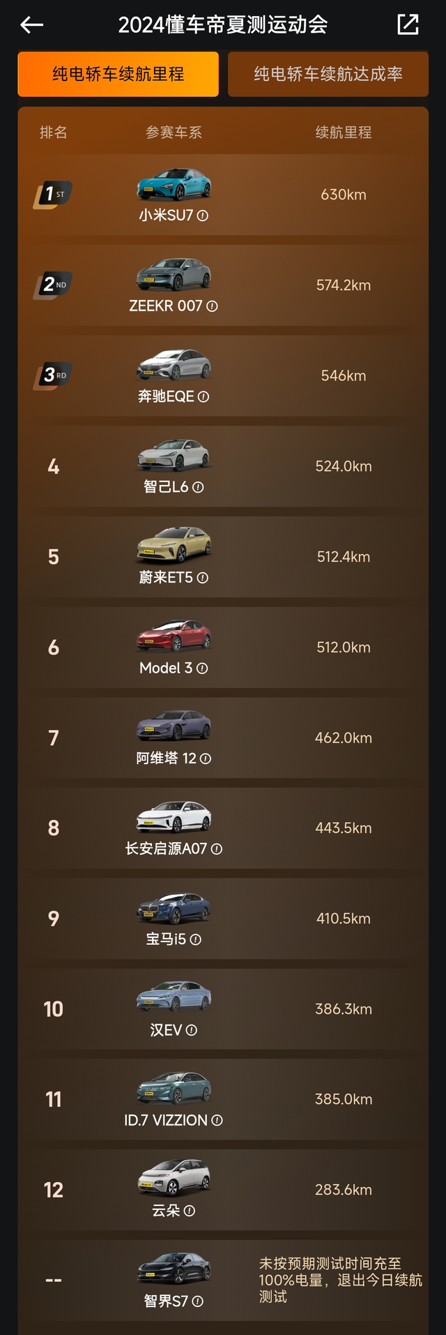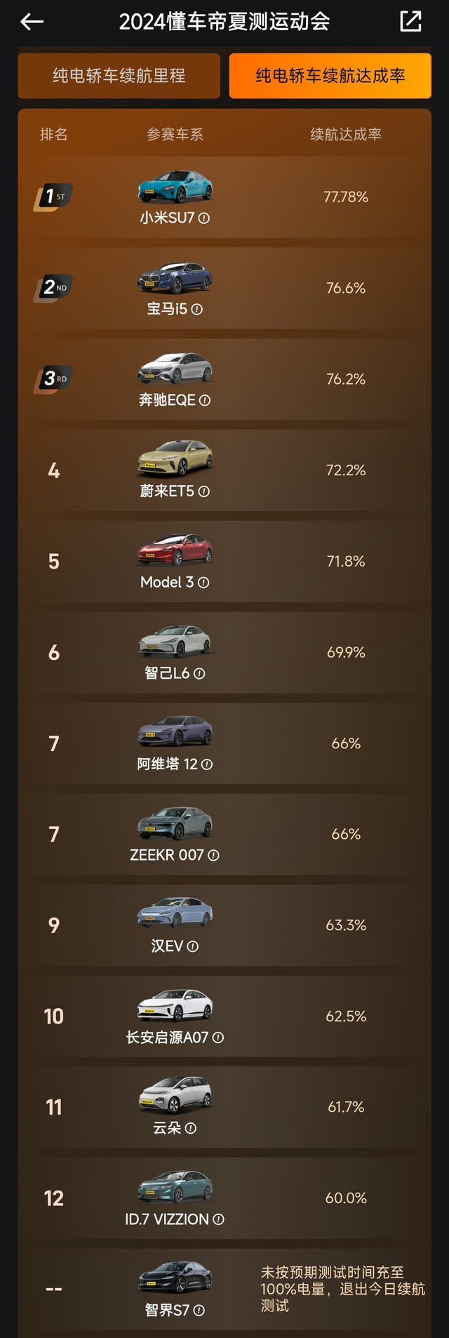 小米SU7双料冠军,777 纯电轿车续航测试,小米SU7 Max整了个双料冠军:续航最长630公里最长,续航达成率77.78%最高,小米造的这第一款车还是真的有点东西。 有人说是厂家派人开车的原因,有人又说什么速度问题,个人觉得懂车帝是开放真实的,全程直播,这结果还是很有说服力的。你怎么看?