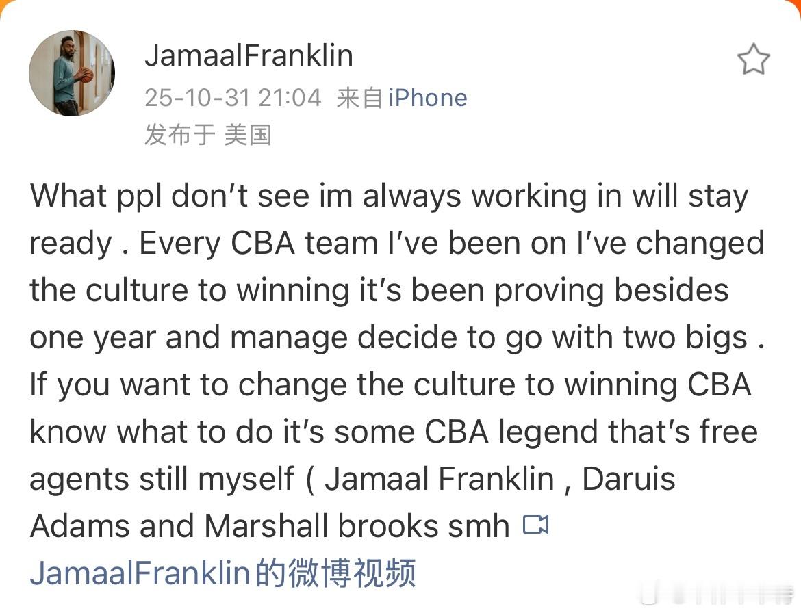 CBA三双王富兰克林在线求职:我和达柳斯-亚当斯、马尚-布鲁克斯都闲着呢,快来签我们。微博发了一周,貌似没有激起一丝水花。