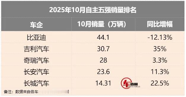 10月份的比亚迪喜忧参半,喜的是10月份销量44.1万台创年内新高,同时海外出口8.35万台,同比暴增155%,忧的是销量同比下降12%,明年新能源购置税减半,压力山大。 自主五强车企10月份销量同比,大家看出门道了吗?大家认为谁更在乎销量?谁更在乎质量?