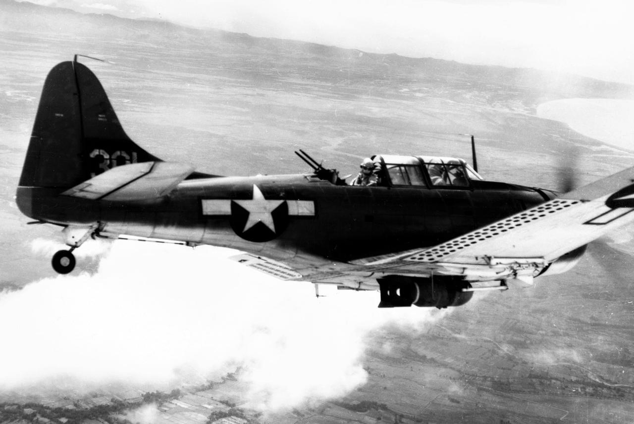 [呲牙] 当年的“航母杀手”——1942年,美国海军陆战队所属的SBD“无畏式”俯冲轰炸机在瓜达尔卡纳尔岛上空执行飞行任务。 SBD“无畏式”俯冲轰炸机(Douglas SBD Dauntless,参见图2~3)是道格拉斯公司生产的舰载俯冲轰炸机,配备1000马力R-1820发动机,最大时速410公里,可携带545公斤炸弹,在中途岛战役中摧毁4艘日军航母(参见图4)。