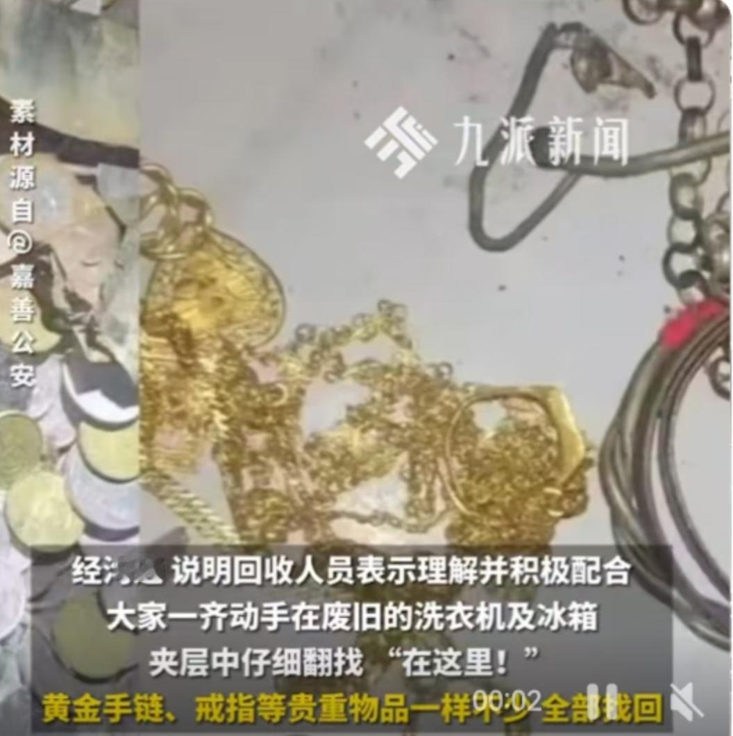 100块卖了3万块的金子!浙江嘉善这对夫妻的“神操作”,看完我人傻了! 你敢信吗?浙江嘉善有位阿姨,把价值3万块的黄金首饰,藏进了准备扔掉的旧冰箱和旧洗衣机里。结果呢?她老公毫不知情,100块钱就把这两台“移动金库”卖给了收废品的。这事儿要是发生在我身上,估计得当场晕过去。别急,这还不是最刺激的,最刺激的是警方的“极限追回”,整个过程堪比动作大片。 事情得从2023年深秋说起。地点,浙江嘉善县惠民街道。主角,陈阿姨和她丈夫老张。那天上午,陈阿姨准备出门,心血来潮想看看自己的“宝贝”——一条黄金手链、三枚戒指、一对耳环,总价值3万元。这一看不要紧,魂差点吓飞了。她藏首饰的地方,那台退役的冰箱和洗衣机,不见了! 陈阿姨赶紧问丈夫老张。老张一脸无辜地表示,昨天下午看那两台大家伙占地方,就联系了常来的王师傅,100块钱让人拉走了。时间点很明确,前一天下午3点15分左右,王师傅开着他的蓝色三轮车,载着陈阿姨的“全部身家”,绝尘而去。陈阿姨当时那个心情,估计比坐过山车还刺激。这可是她攒了多少年的家底啊,尤其是那条35克重的黄金手链,还是结婚时老张给买的,意义非凡。 第二天上午9点多,陈阿姨几乎是冲进了嘉善县公安局惠民派出所。接待她的是李警官。听完陈阿姨带着哭腔的叙述,李警官心里咯噔一下,脑子里就一个念头:快!必须抢在废品被拆解前找到!干他们这行的都清楚,废品回收站的效率高得吓人,这些电器一旦上了拆解台,变成一堆零件,别说黄金了,根针都难找。 一场与时间的赛跑,正式开始。 李警官和同事们立刻调取了惠民街道周边所有的监控录像。一帧一帧地看,一分一秒地找。终于,那辆蓝色的三轮车出现了。监控画面清晰地记录下,王师傅在下午3点45分,也就是收走电器后半小时,把车开进了城西的一家大型废品回收站。目标锁定!此时,距离电器被卖掉,已经过去了整整18个小时。每一秒,都让陈阿姨的心悬得更高一分。 警车呼啸着赶往城西的废品回收站。眼前的景象让所有人都倒吸一口凉气。那地方简直就是家电的坟场,废旧电器堆得像小山一样。王师傅正在里面埋头干活,看到警察找上门,一脸茫然。当警察说明来意,告诉他那两台电器里可能藏着价值3万的黄金时,王师傅的眼睛瞪得像铜铃:“啥?里面……有黄金?”他干了十多年废品回收,这种“奇遇”还是头一遭。 万幸中的万幸!因为回收站当天业务实在太忙,这两台“价值连城”的电器还没来得及被“大卸八块”。王师傅二话不说,立刻放下手里的活,带着警察在电器堆里翻找。那场面,简直比大海捞针还刺激。洗衣机内桶的夹层,冰箱厚实的保温层……所有可能藏东西的地方,都被仔细排查了一遍。 时间一分一秒过去,所有人的心都提到了嗓子眼。终于,在一个小时后,伴随着一声惊喜的呼喊,那抹熟悉的金色光芒出现了!黄金手链、戒指、耳环,一件不少,完好无损地躺在民警的手心。当陈阿姨从民警手中接过失而复得的“宝贝”时,激动得半天说不出一个字,眼泪却止不住地往下流。 从陈阿姨报警到黄金被追回,警方用了不到4个小时。这效率,这精准度,必须给嘉善警察点个大大的赞!事后,李警官也借着这个机会给大家提了个醒:家里有贵重物品,最好还是存银行保险柜。非要放家里,也一定得跟家人打个招呼,别搞这种“惊喜”藏匿法,不然惊喜随时可能变惊吓。 这事儿在当地一下子就传开了,有人笑称这是“史上最贵的废品”,也有人说老张这波操作“亏大了”。老张自己呢,不好意思地挠着头,一个劲儿地说:“以后处理旧东西,一定先跟老婆商量好。”收废品的王师傅也乐了,说以后收东西前都得先问一句:“大哥大姐,里面没藏啥宝贝吧?” 陈阿姨算是吃一堑长一智,现在已经把所有首饰都存进了银行保险箱。她说:“这次真是给我上了一课,以后再也不敢这么大意了。”而那两台差点造成“惨案”的废旧家电,最终也还是被当废品处理了——当然,是在警察和王师傅反复确认,里面再也没有任何值钱东西之后。 说真的,这事儿听起来像个段子,但它真真切切地发生了。它给我们每个人都提了个醒:第一,家庭沟通太重要了,别把“秘密”变成“炸弹”。第二,贵重物品的存放,千万别图省事或者自作聪明,银行保管箱才是最稳妥的选择。第三,万一真遇到这种事,别慌,第一时间报警,提供准确信息,时间就是找回财物的生命线。你看,陈阿姨要不是及时报警,警察要不是火速追踪,这3万块钱,可能就真的随着那堆废铜烂铁,永远消失了。 以上内容仅供参考和借鉴
