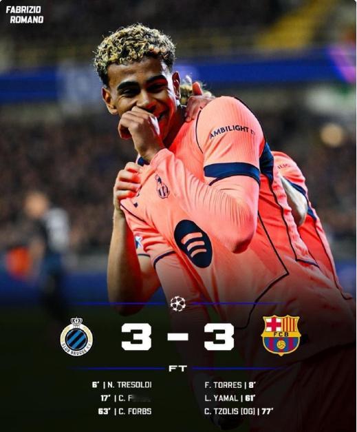 冠联赛阶段第4轮中,巴萨客场3-3战平布鲁日,本赛季欧冠首次战平。特雷索尔迪先拔头筹,弗布斯梅开二度,巴萨三度落后三度扳平,费兰-托雷斯与亚马尔先后破门,亚马尔造成佐利斯自摆乌龙。