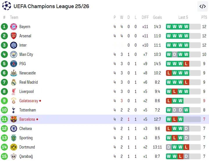 在布鲁日3-3战平后,蓝红军团以7分的成绩跌至积分榜第11位,不仅未能进入直接晋级区,更落后榜首三队整整5分之多。