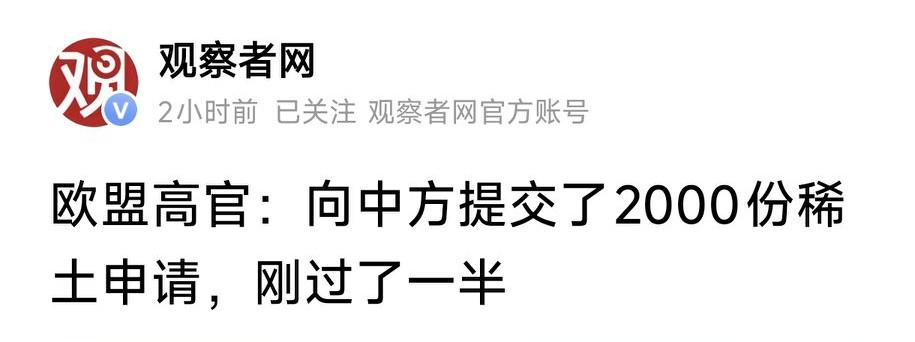 欧盟高官透露:已向中方提交2000份稀土申请,目前审核刚过半!不过欧盟并未消极等待,一边催促中方加速处理剩余申请,一边着手开发欧洲本地的稀土资源。稀土素有“工业维生素”之称,欧盟如此重视也在情理之中。此事也让我们清晰看到中国稀土在国际上的重要地位。 有网友直言:凡是荷兰公司的申请,一克都别卖。 也有网友提议:对于非军事用途的需求,能否让需求方提供元器件技术规格指标,由中国企业进行加工生产?如此一来,既能提升中国企业的生产水平,需求方也能省心,还能建立更深入的供应链关系,这岂不比单纯出口原料更为划算?