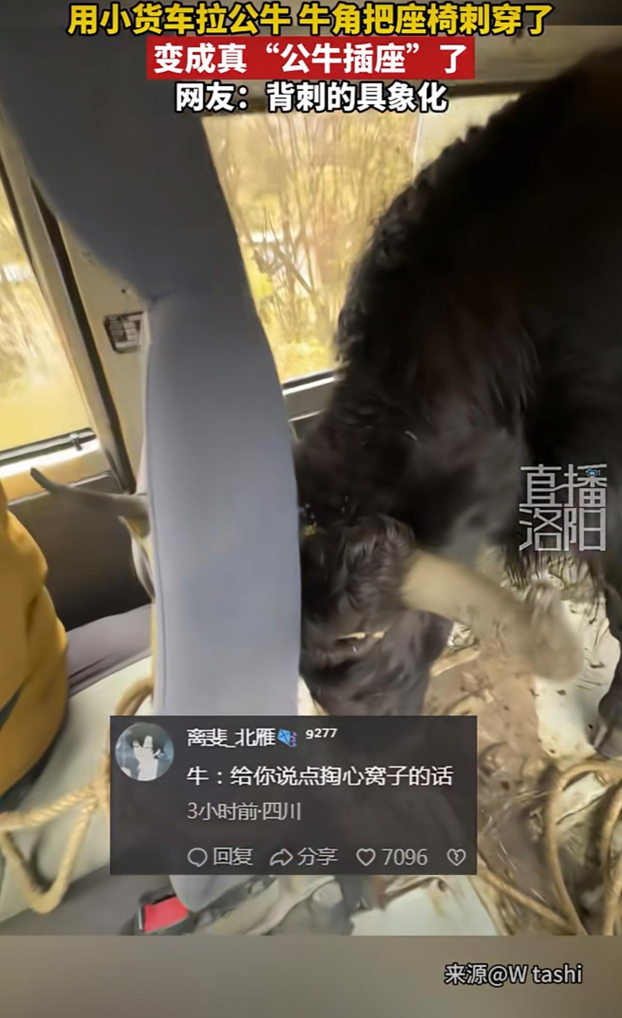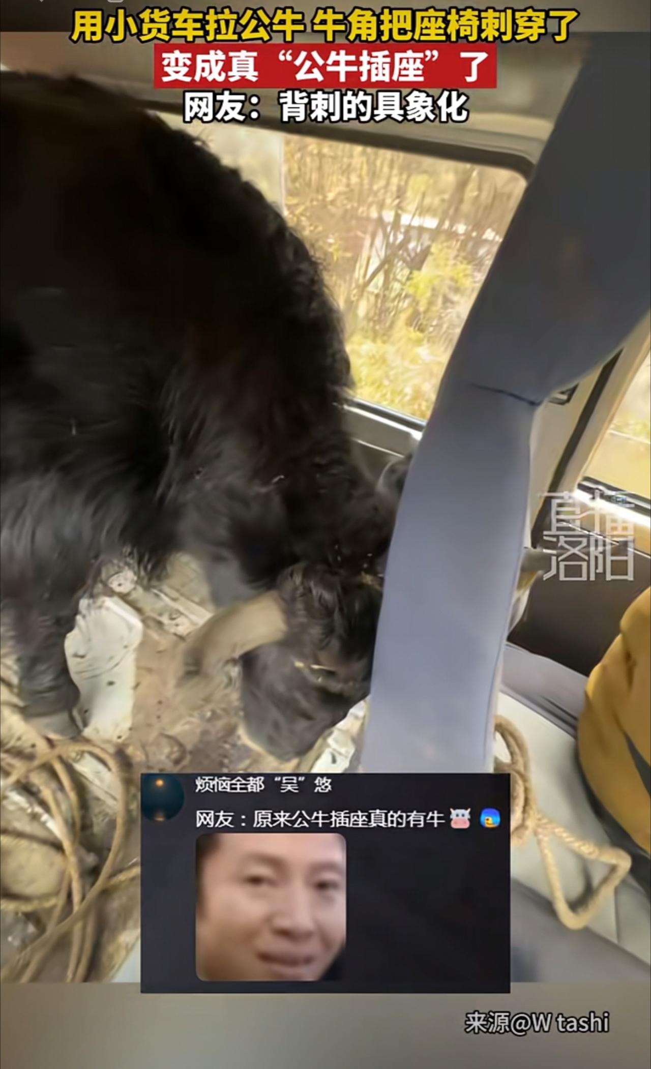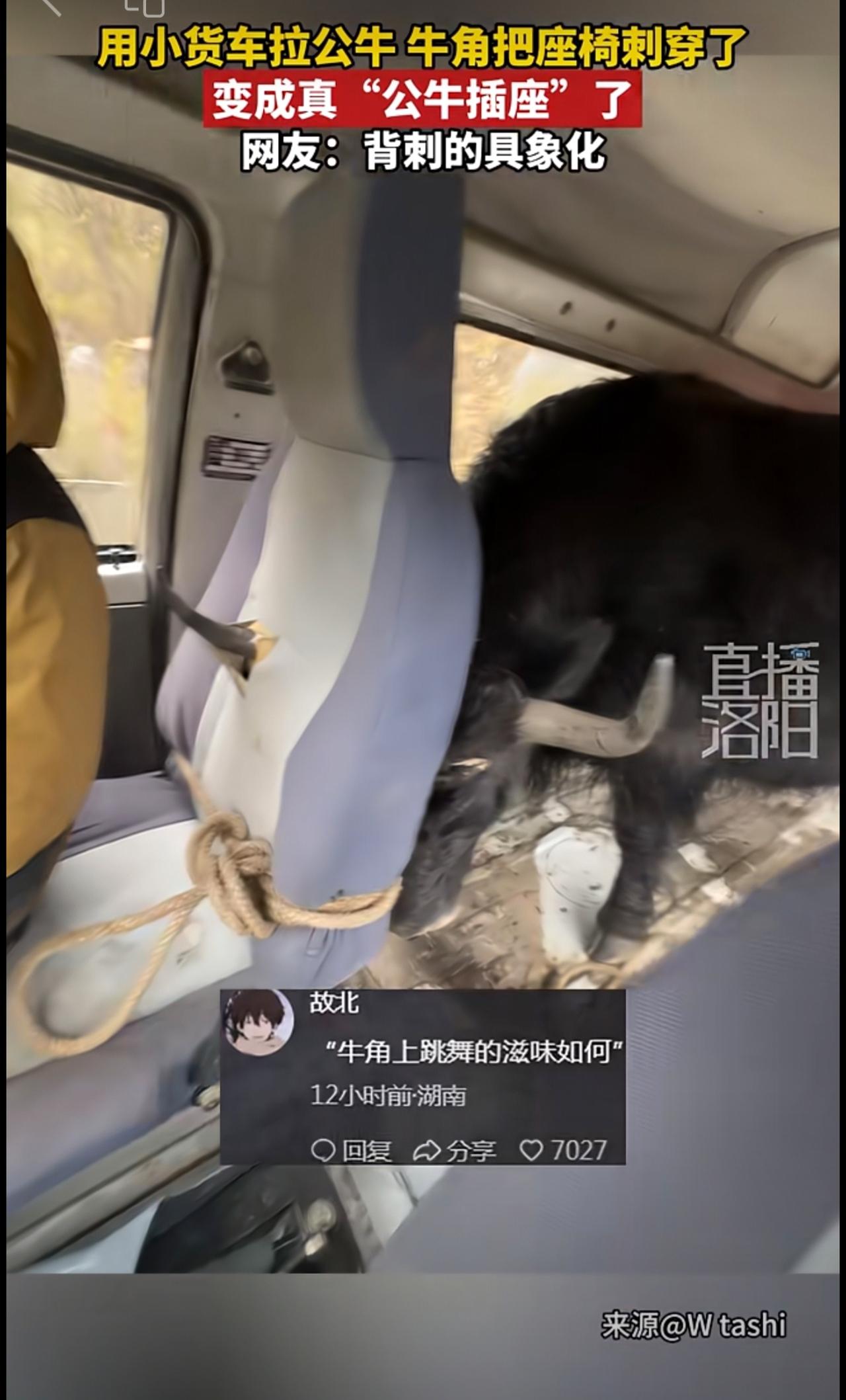 用小货车拉公牛,牛角把座椅刺穿了!变成真“公牛插座”了...…